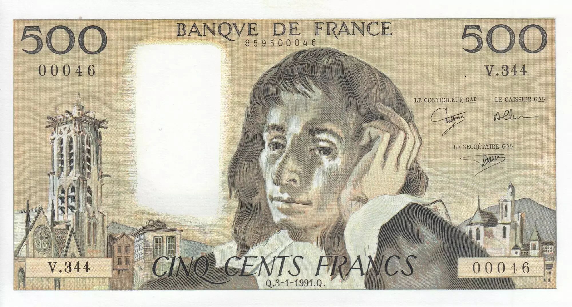 Accueil > Billets Français > Billets Banque de France > Billets 500 francs > Pascal type 1968 (1968-1993) > France 500 Francs - Pascal - 03-01-1991 - Série V.344 - Petit Numéro