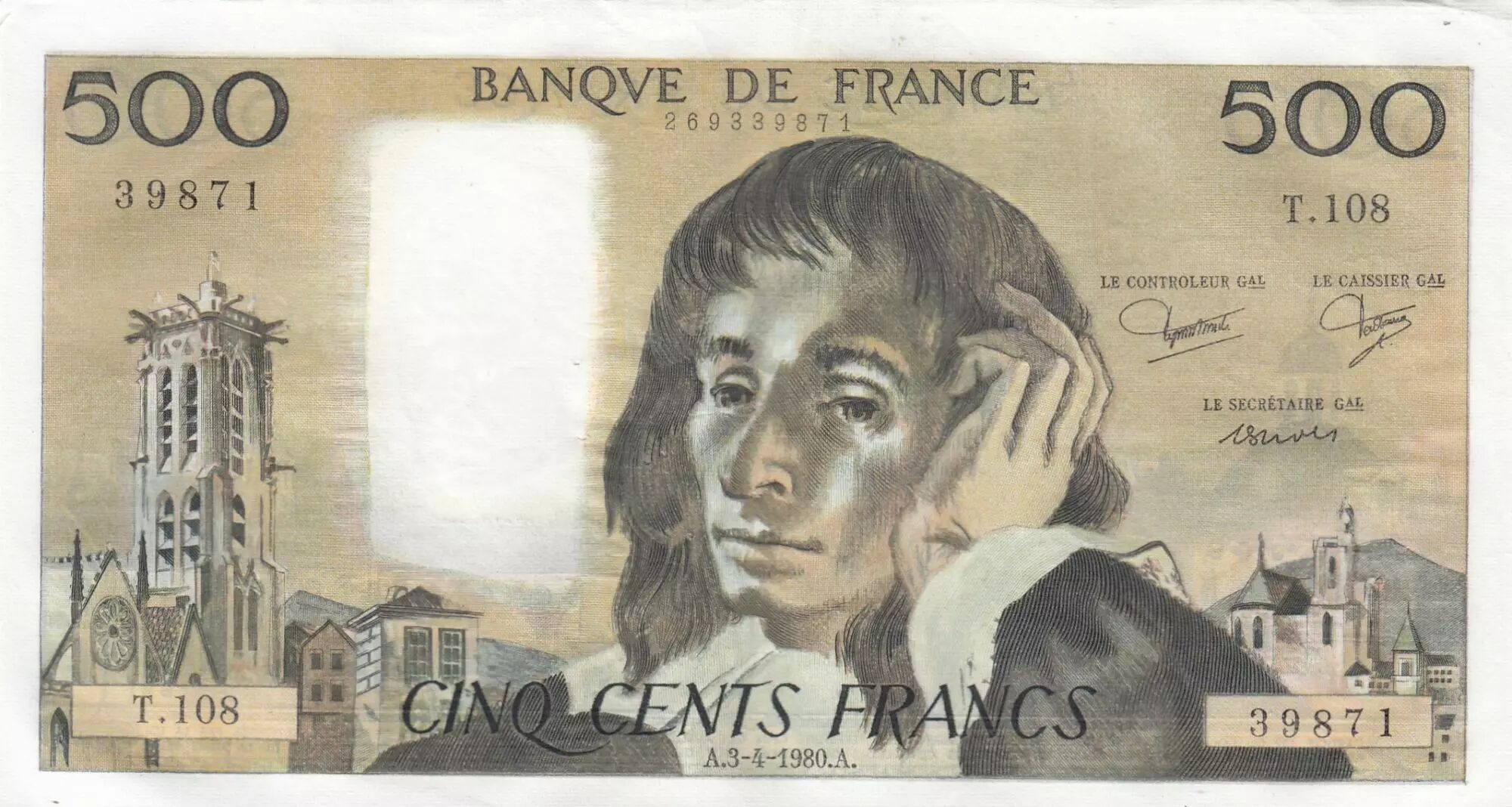 Accueil > Archivage > France 500 Francs Pascal - 03-04-1980 - Série T.108