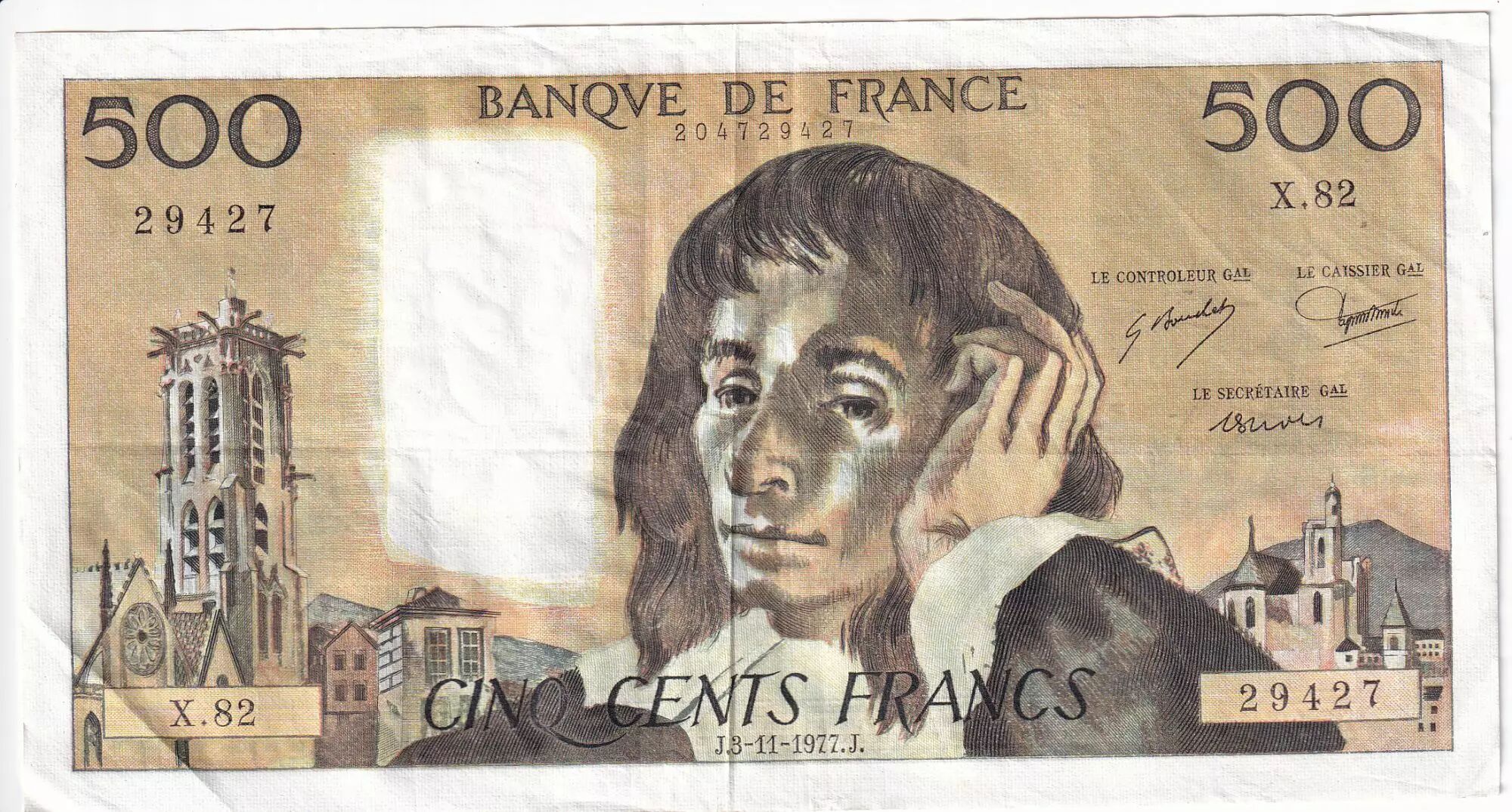 Accueil > Archivage > France 500 Francs Pascal - 03-11-1977 - Série X.82- TTB - F.71.17