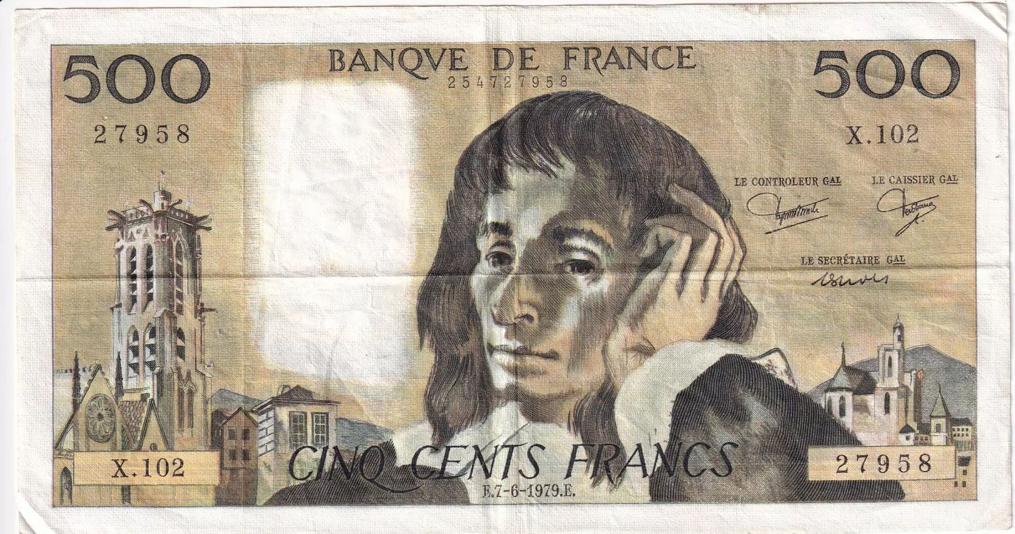 Accueil > Billets Français > Billets Banque de France > Billets 500 francs > Pascal type 1968 (1968-1993) > France 500 Francs Pascal - 07-06-1979 - Série X.102 - TTB - F.71.20