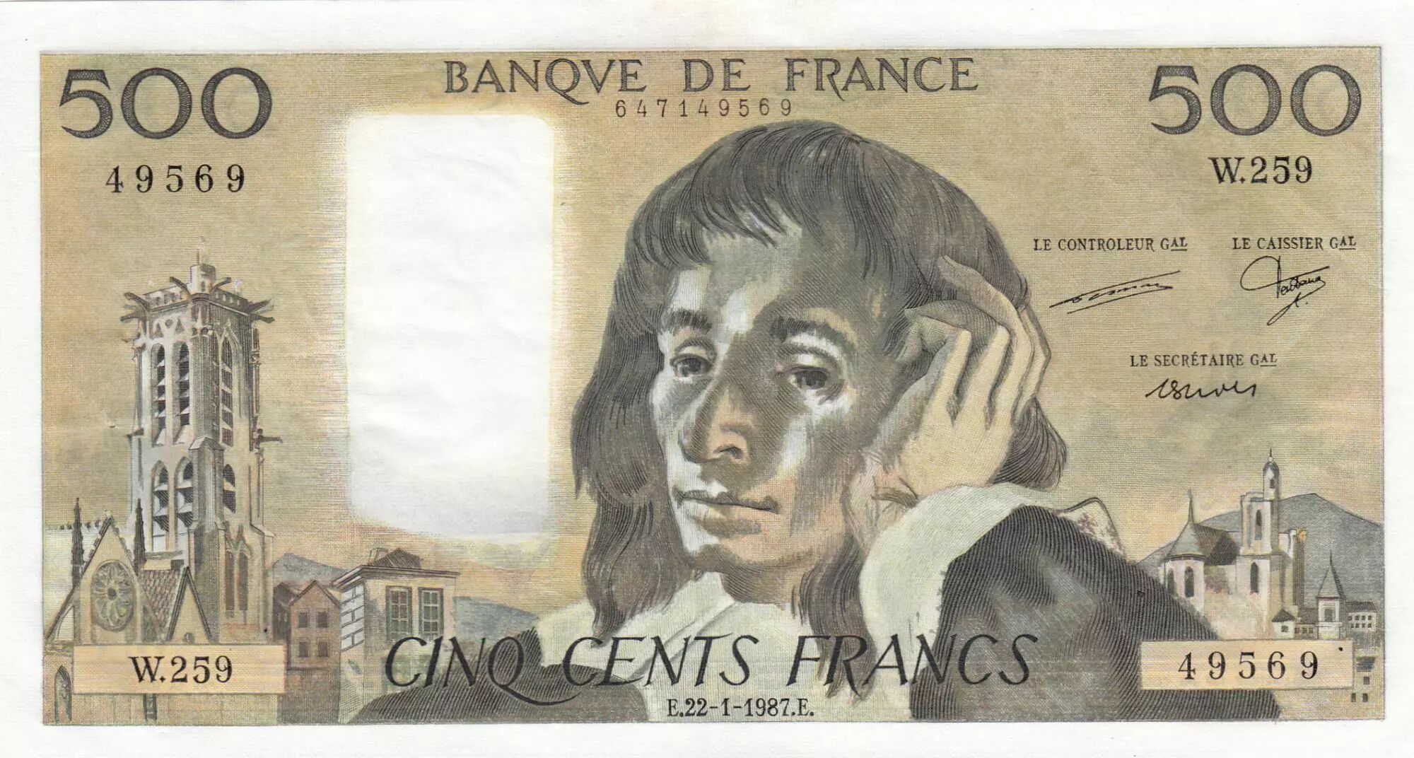 Home > > France 500 Francs Pascal - 22-01-1987 Serial W.259 - XF - P.156