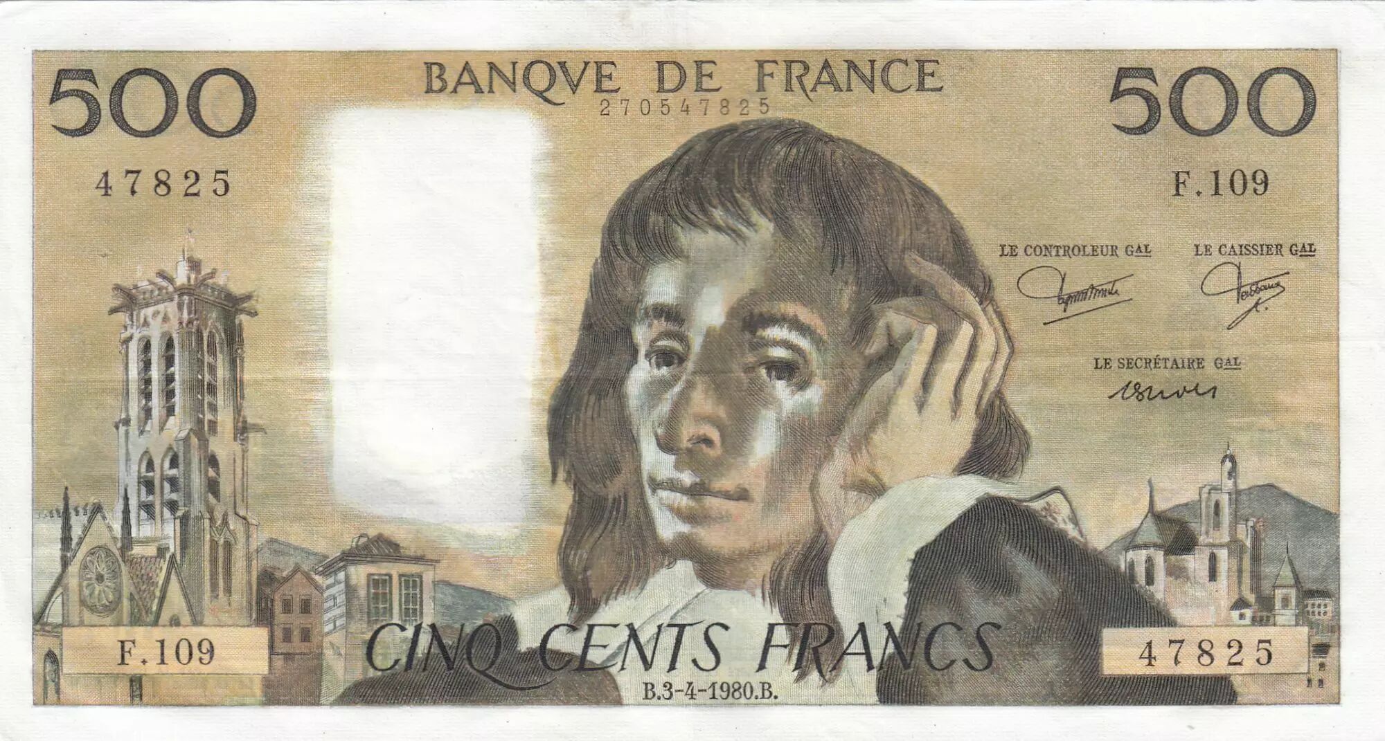 Home > > France 500 Francs Pascal - St Jacques Tower - 03-04-1980 - Serial F.109 - VF