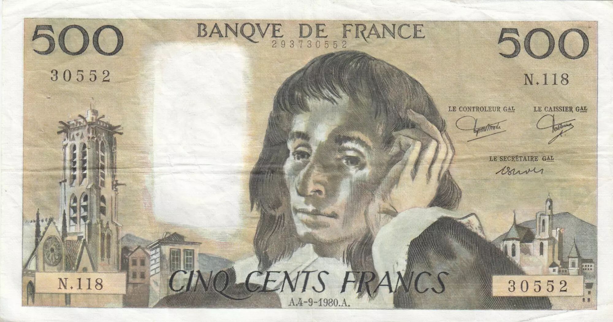 Home > > France 500 Francs Pascal - St Jacques Tower - 04-09-1980 - Serial N.118 - VF