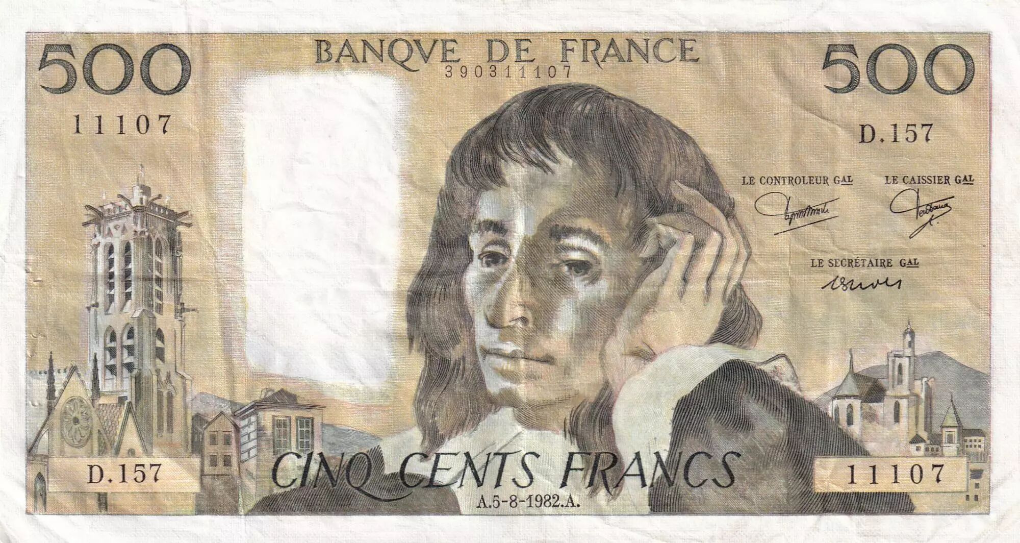 Home > > France 500 Francs Pascal - St Jacques Tower - 05-08-1982 - Serial D.157 - VF