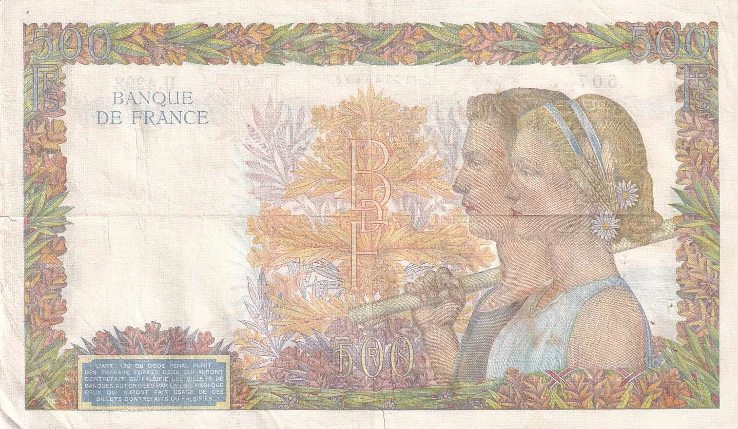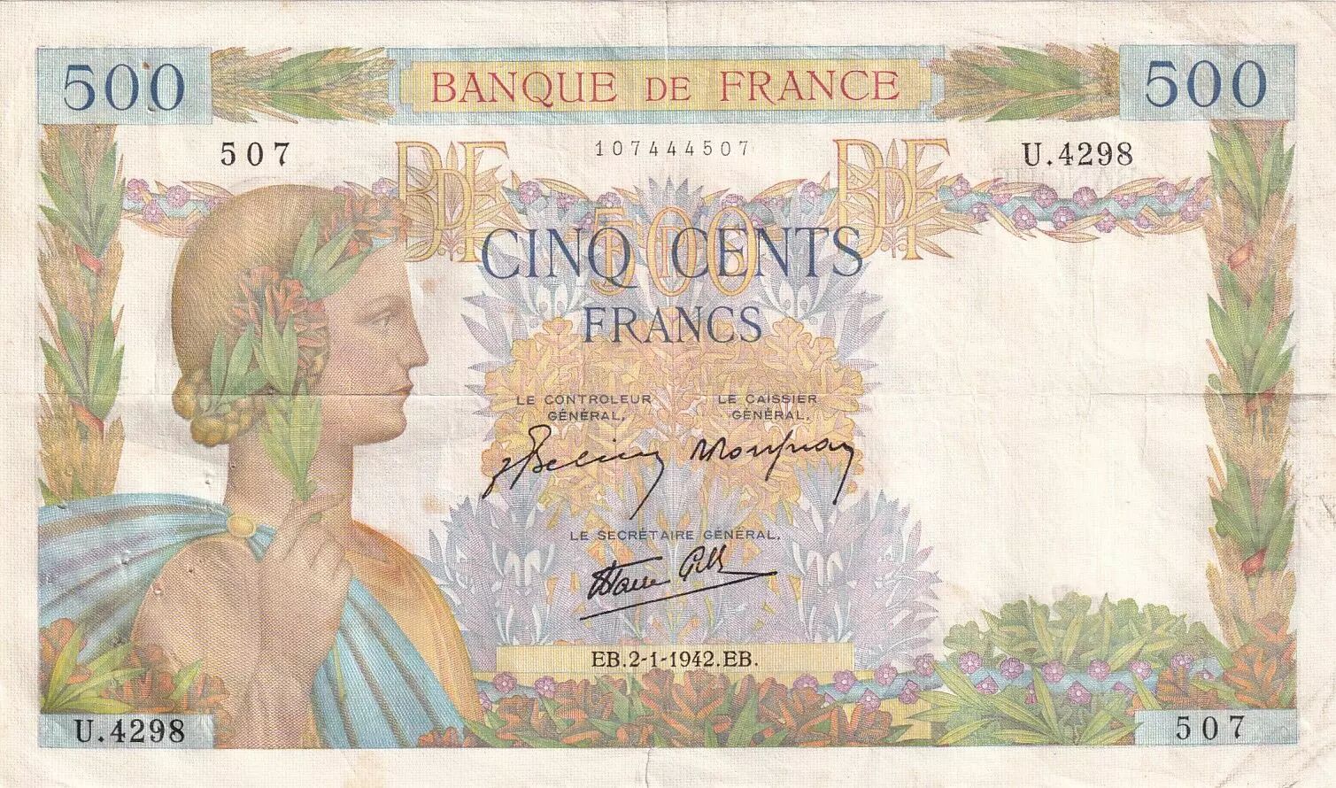 Banknote France 500 Francs Pax with wreath - 02-01-1942 Serial U.4298