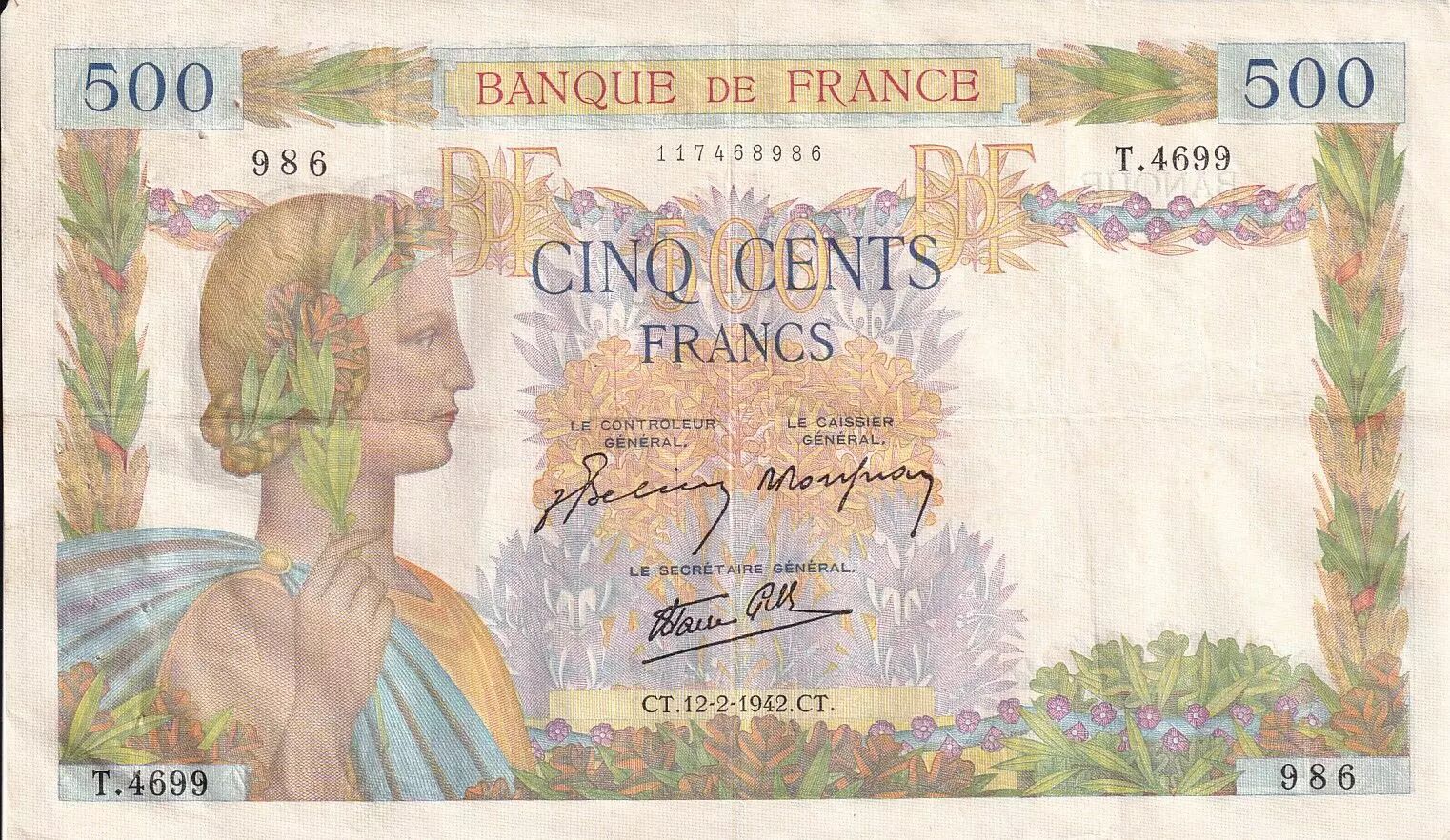 Banknote France 500 Francs Pax with wreath - 12-02-1942 Serial T.4699