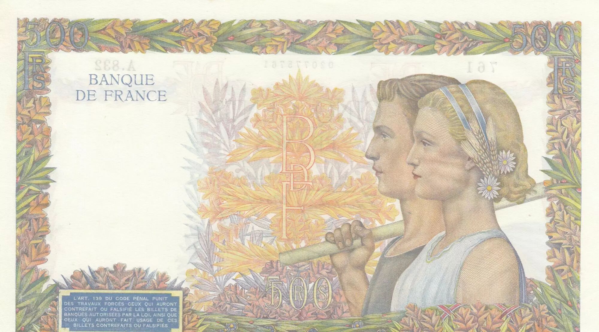 Home > > France 500 Francs - Pax with wreath - 25-07-1940 - Serial A.832