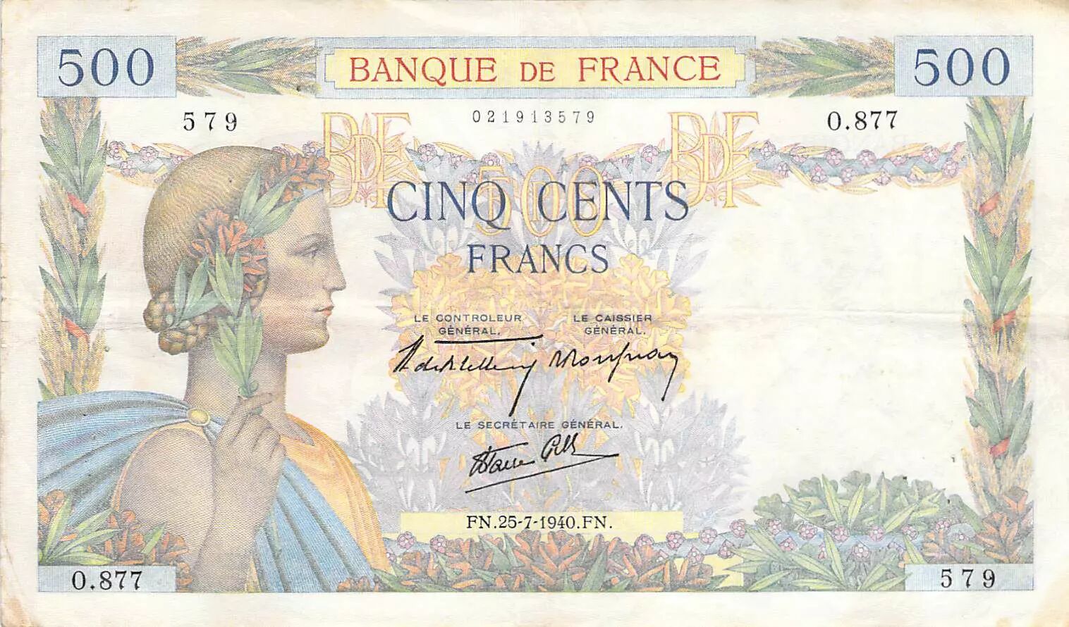 Banknote France 500 Francs Pax with wreath - 25-07-1940 Serial O.877 - VF