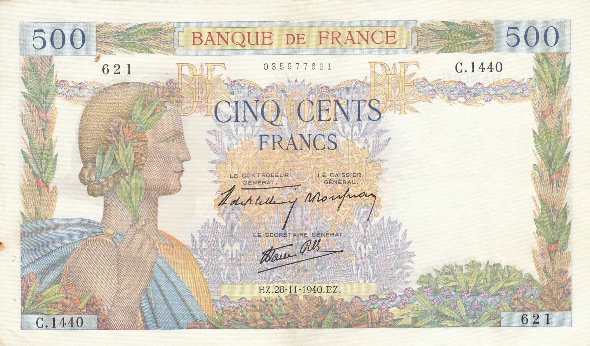 This French banknote has a face value of 500 francs and was issued on November 28, 1940. It belongs to series C.1440.