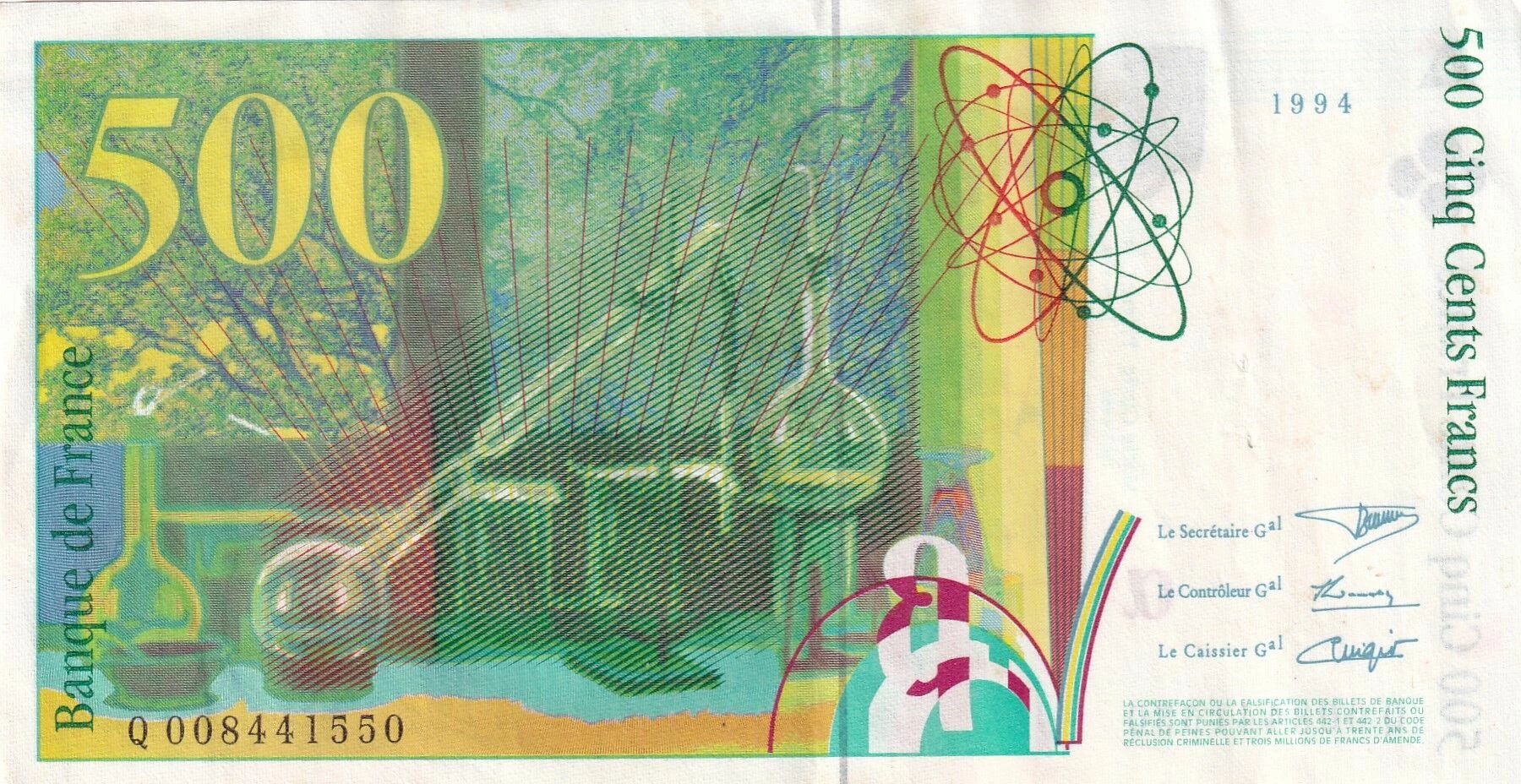 The 500 francs ?Pierre and Marie Curie? banknote issued in 1994, Q series, belongs to the last generation of Banque de France banknotes before the introduction of the euro. It is part of a period of modernization for French banknotes, both aesthetically and technically, gradually succeeding the Pascal type.