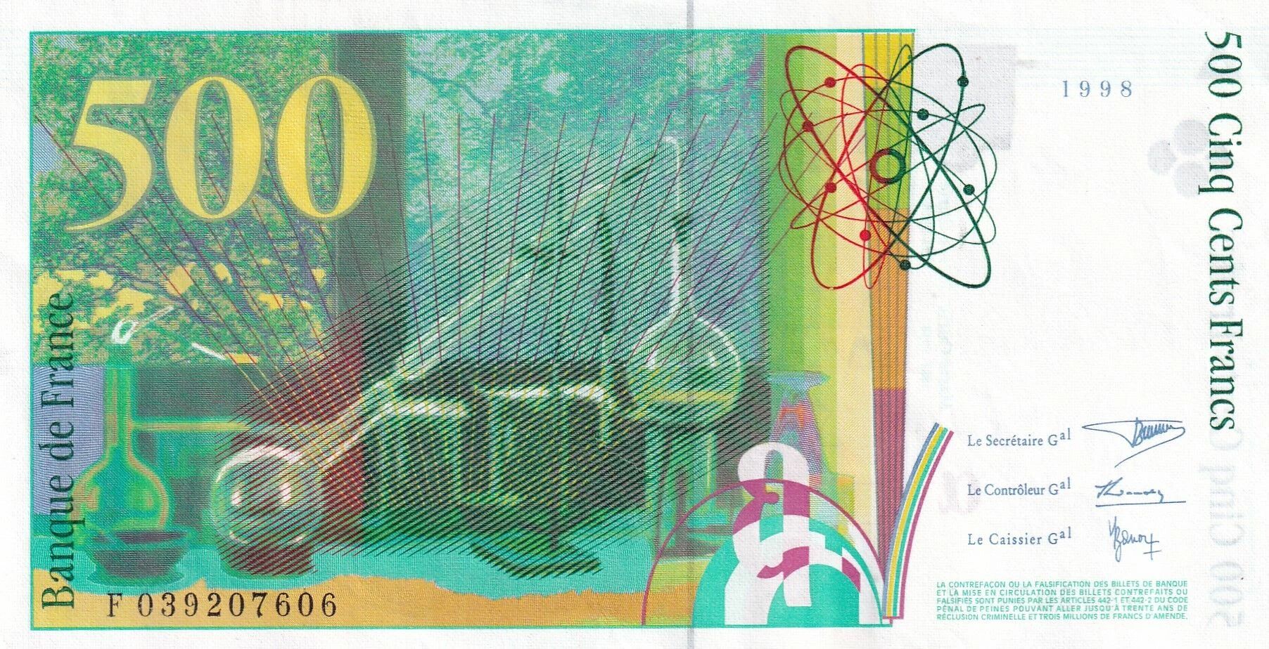 The 500 Francs ?Pierre and Marie Curie? banknote dated 1998, series F, belongs to the final issues of the French Franc before the introduction of the Euro. It represents the final circulation phase of this type, within a context of European monetary transition already underway.