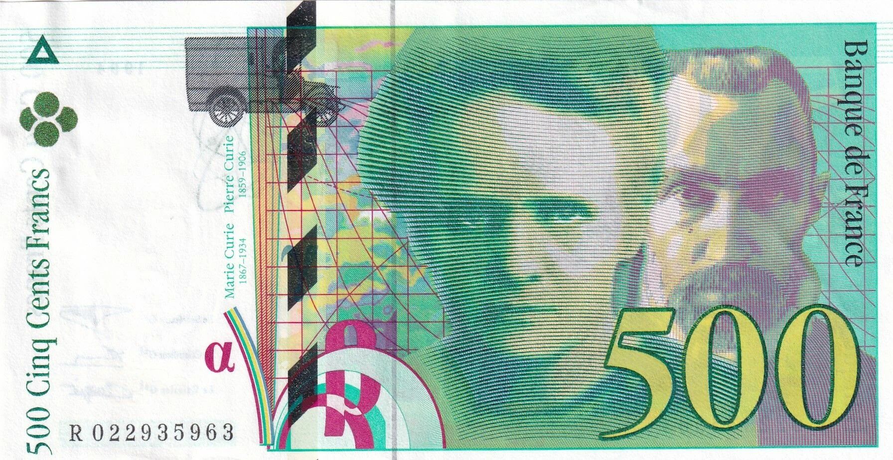 Le billet de 500 francs ?Pierre et Marie Curie? émis en 1994, série R, appartient à la dernière génération de billets de la Banque de France avant le passage à l?euro. Il symbolise le renouveau graphique et technologique des billets français dans les années 1990, succédant progressivement au type Pascal.