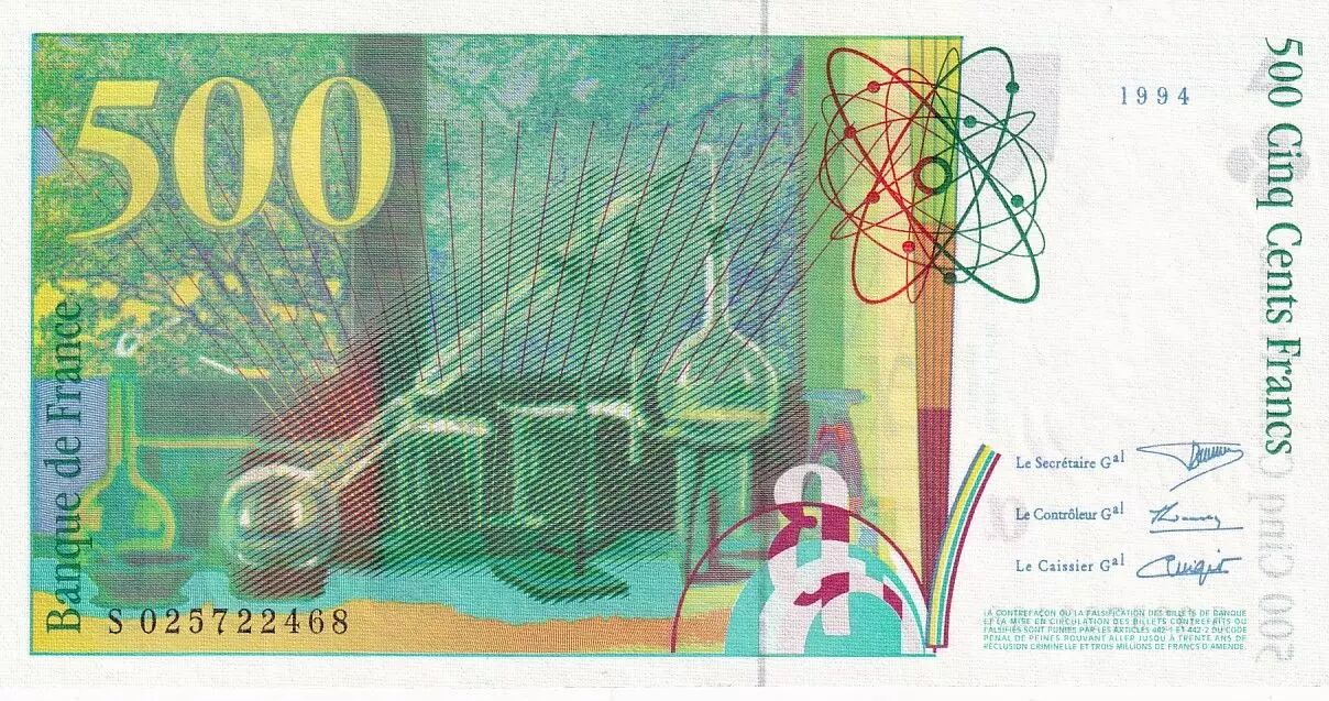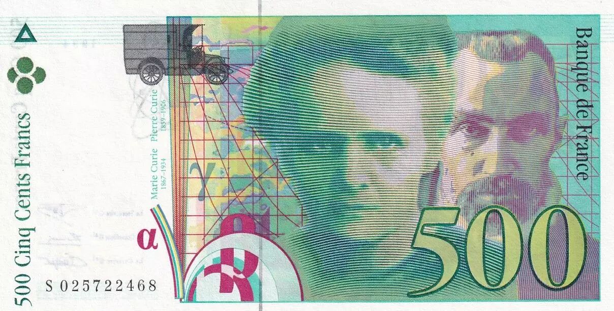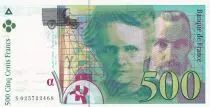 Ce billet de 500 francs présente des caractéristiques de sécurité avancées pour prévenir la contrefaçon. On peut noter la présence d'un filigrane représentant les visages de Pierre et Marie Curie, visible par transparence. Des micro-impressions et des encres spéciales sont également utilisées pour renforcer la sécurité du billet. Le format du billet est de dimensions standard pour les coupures françaises de cette époque.