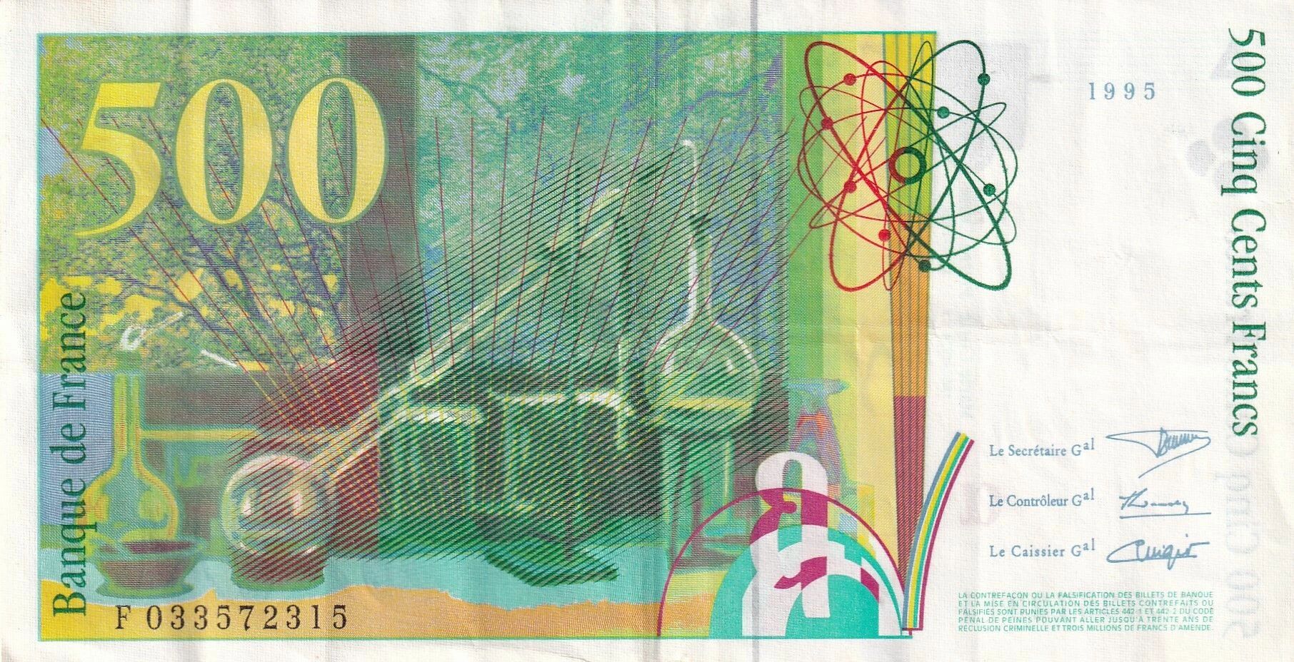 Sur le plan numismatique, le 500 francs Curie 1995 série F est un billet emblématique de la fin du franc. Il est apprécié pour son design moderne, son thème scientifique fort et sa place dans la transition vers la monnaie européenne.