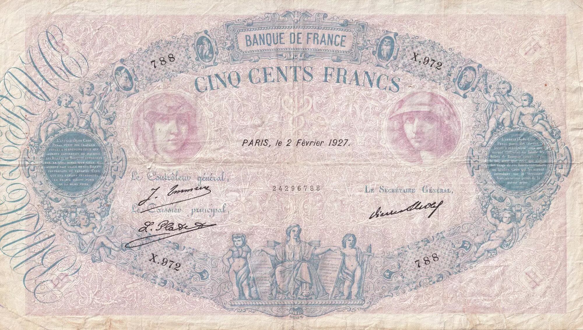 Home > > France 500 Francs - Pink and blue - 02-02-1927 - Serial X.972 - P.66