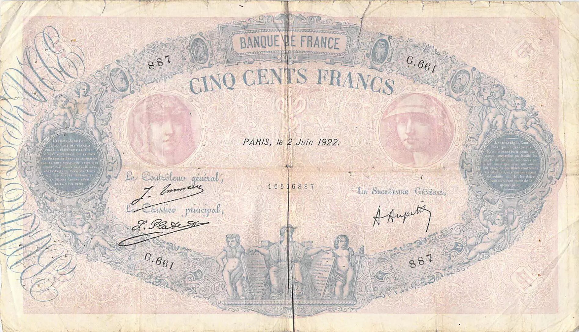 Home > > France 500 Francs Pink and Blue - 02-06-1922 Serial G.661 - G+