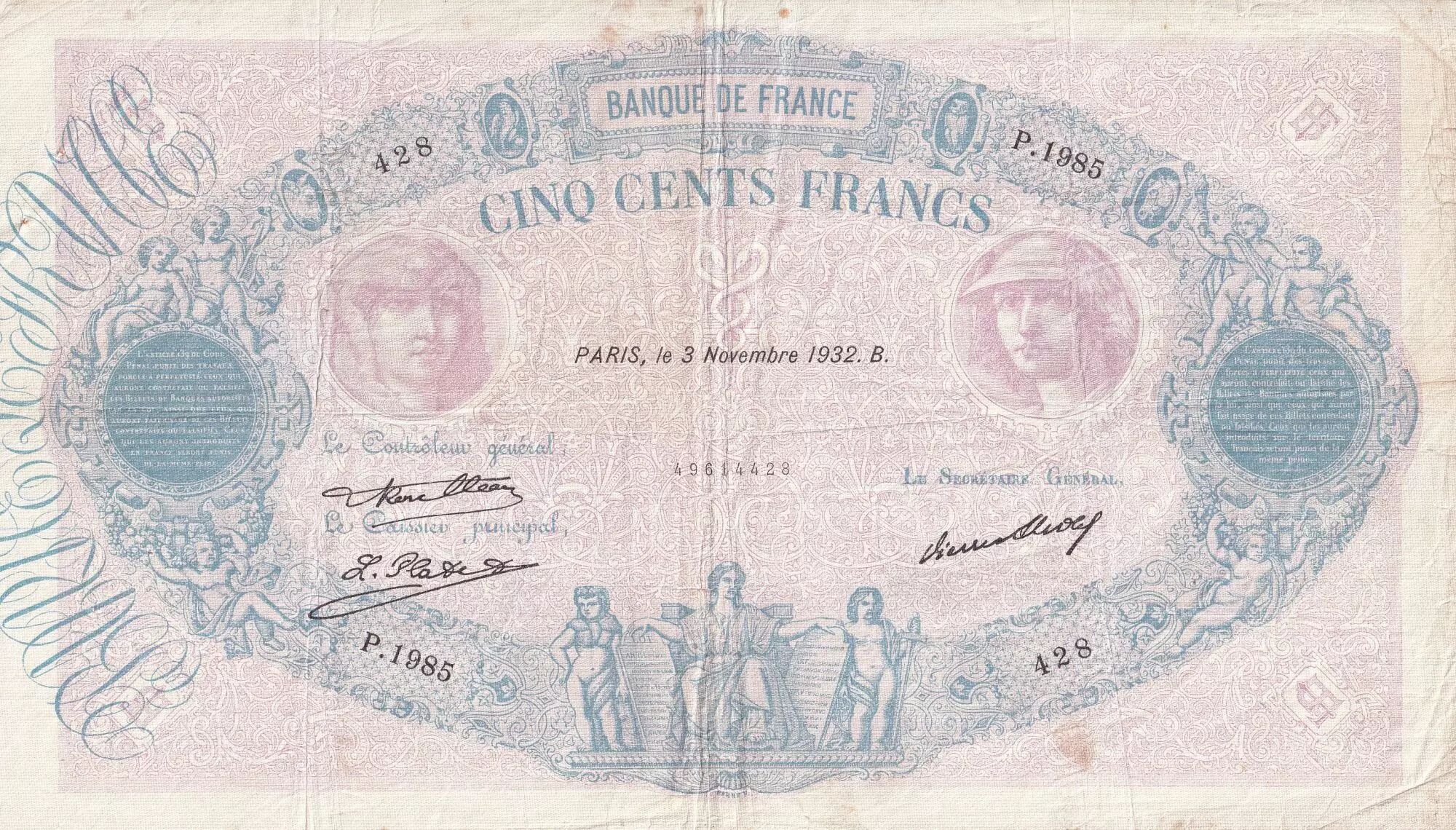 Home > French Banknotes > Bank of France Banknotes > 500 Francs Banknotes > Blue and Pink Type 1888 (1888-1940) > France 500 Francs - Pink and blue - 03-11-1932 - Serial P.1985 - P.66