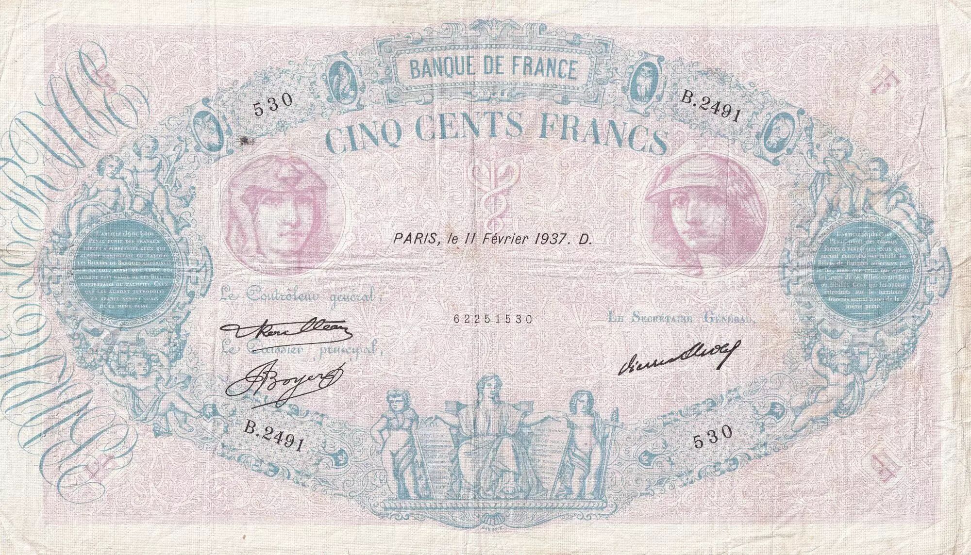 Home > French Banknotes > Bank of France Banknotes > 500 Francs Banknotes > Blue and Pink Type 1888 (1888-1940) > France 500 Francs - Pink and blue - 11-02-1937 - Serial B.2491 - P.66