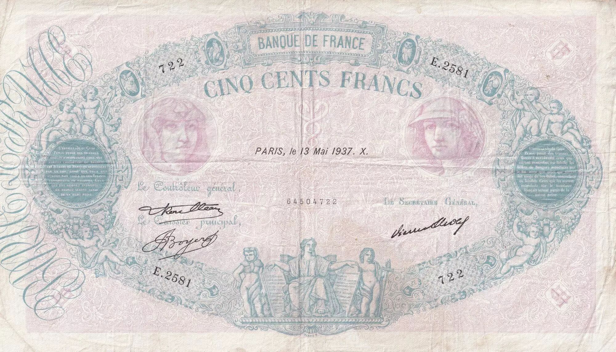Banknote France 500 Francs - Pink and blue - 13-05-1937 - Serial E.2581 - P.66