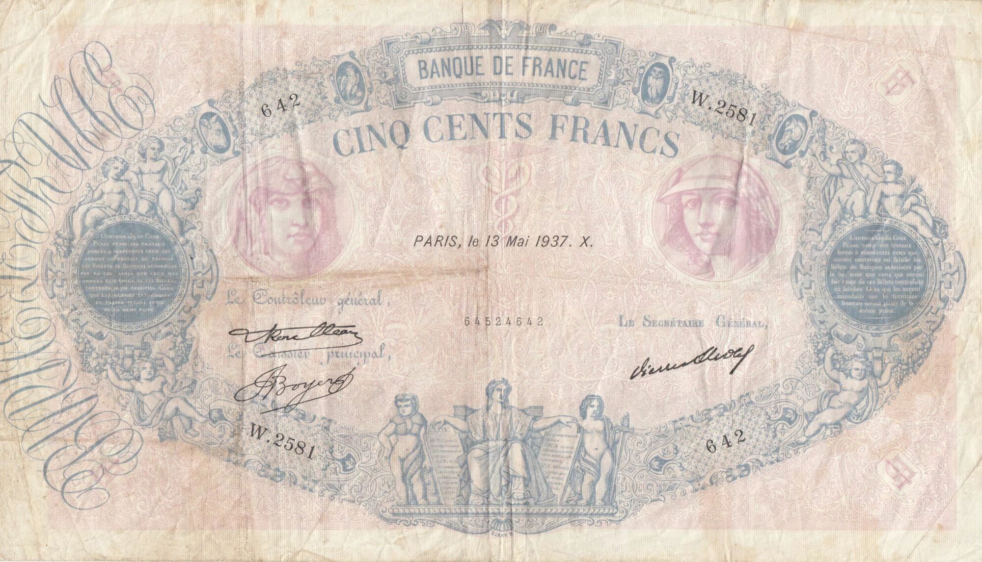 Equipped with a watermark bearing the words ?500 F? and ?Banque de France?, this banknote meets the security standards of its time. It was withdrawn from circulation in 1943 and then demonetized on June 4, 1945, marking the end of this emblematic type.