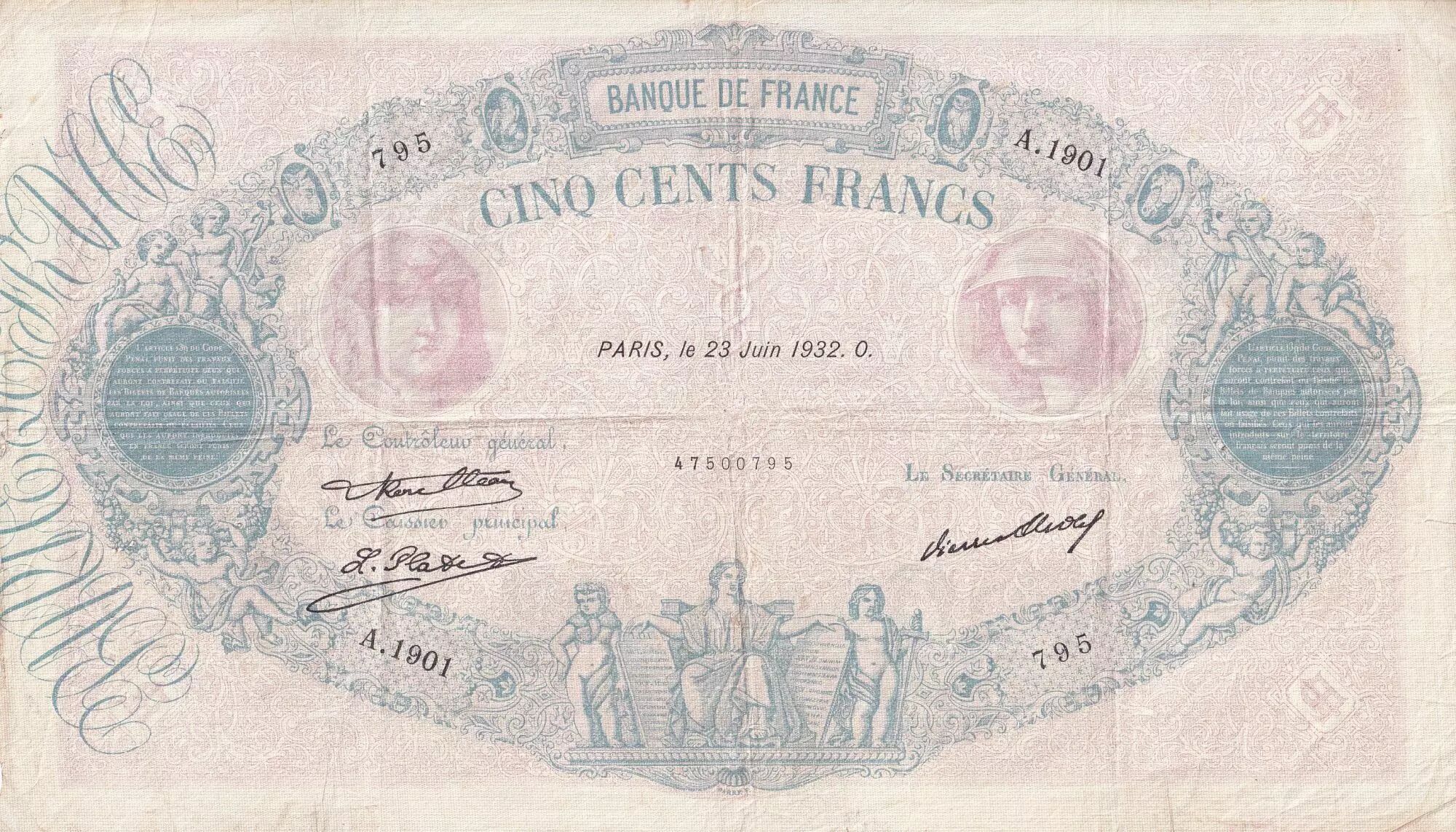Home > French Banknotes > Bank of France Banknotes > 500 Francs Banknotes > Blue and Pink Type 1888 (1888-1940) > France 500 Francs - Pink and blue - 23-06-1932 - Serial A.1901 - P.66
