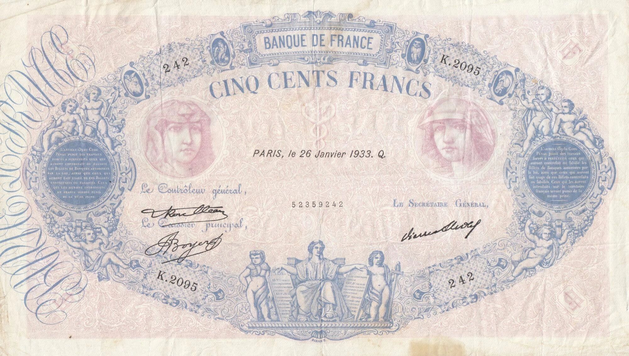 The 500 Francs Blue and Pink banknote, dated January 26, 1933, is one of the great classic denominations of the Banque de France, inherited from an old type created at the end of the 19th century. Issued in the last years of circulation of this model, it testifies to an era when French banknotes combined artistic richness and strong symbolism.