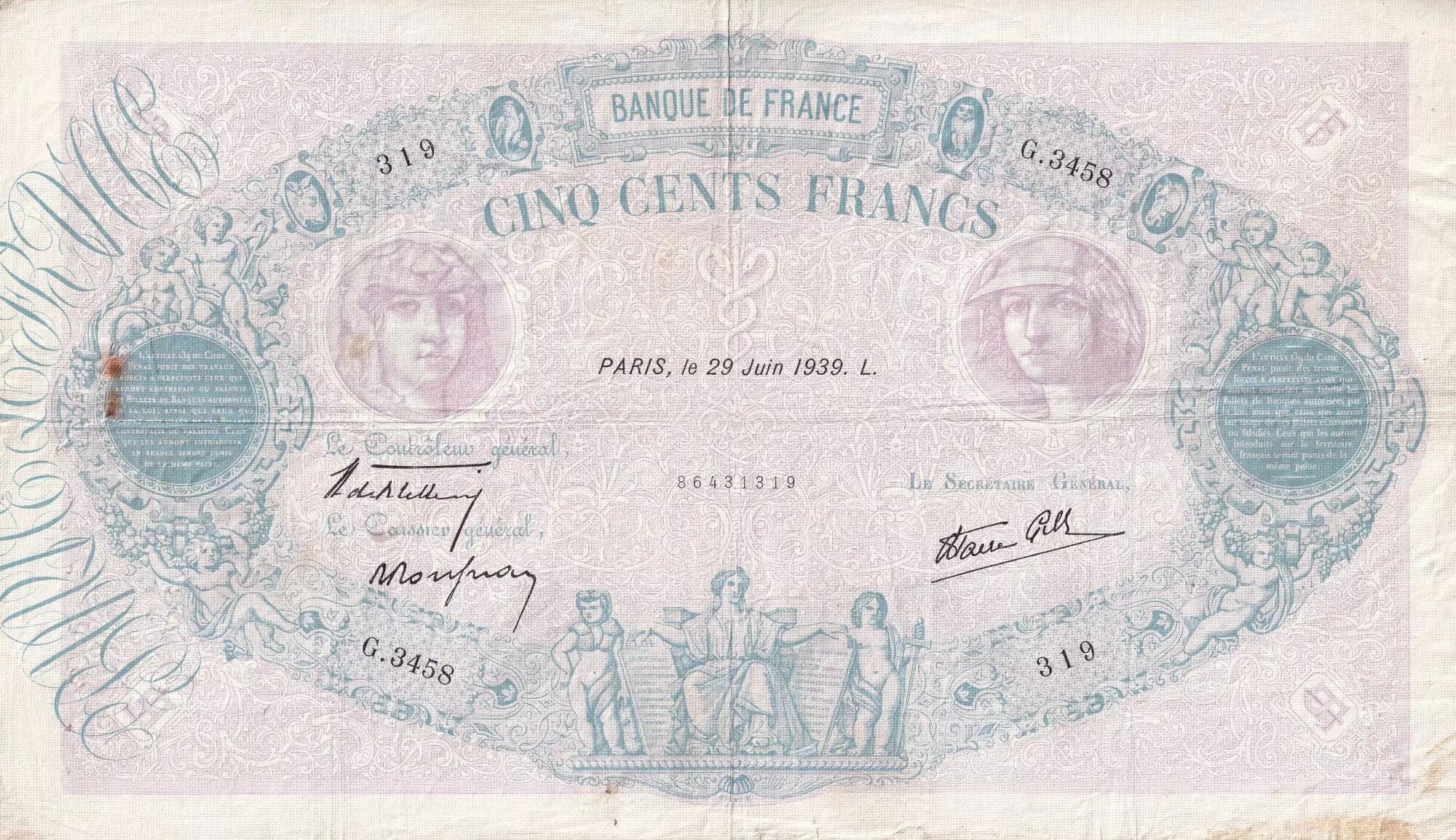 Home > French Banknotes > Bank of France Banknotes > 500 Francs Banknotes > Blue and Pink Type 1888 (1888-1940) > France 500 Francs - Pink and blue - 26-06-1939 - Serial G.3458 - P.66