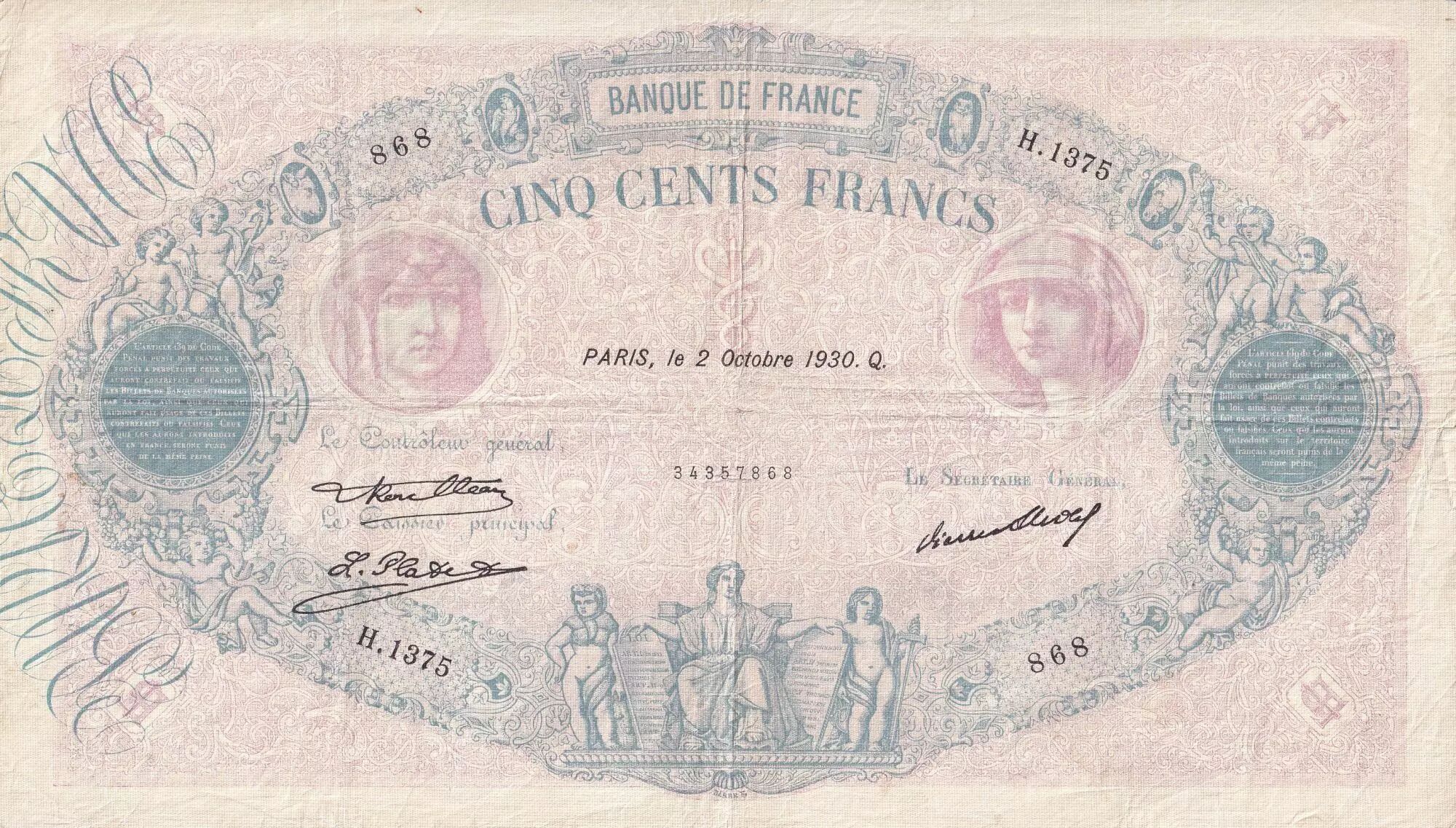 Accueil > Archivage > France 500 Francs - Rose et Bleu - 02-10-1930 - Série H.1375 - F.30.33