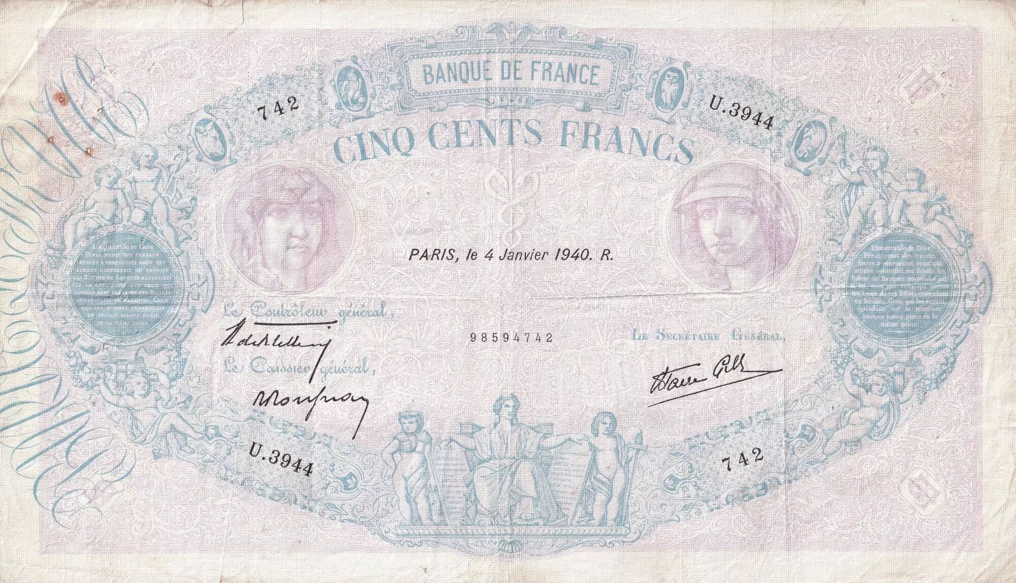 Accueil > Billets Français > Billets Banque de France > Billets 500 francs > Bleu et Rose type 1888 (1888-1940) > France 500 Francs - Rose et Bleu - 04-01-1940 - Série U.3944 - F.31.55