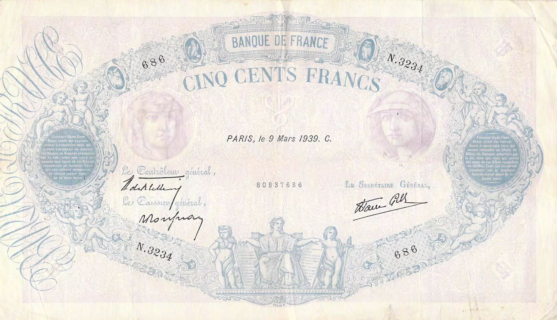 Accueil > Archivage > France 500 Francs Rose et Bleu - 09-03-1939 Série N.3234 - TB+