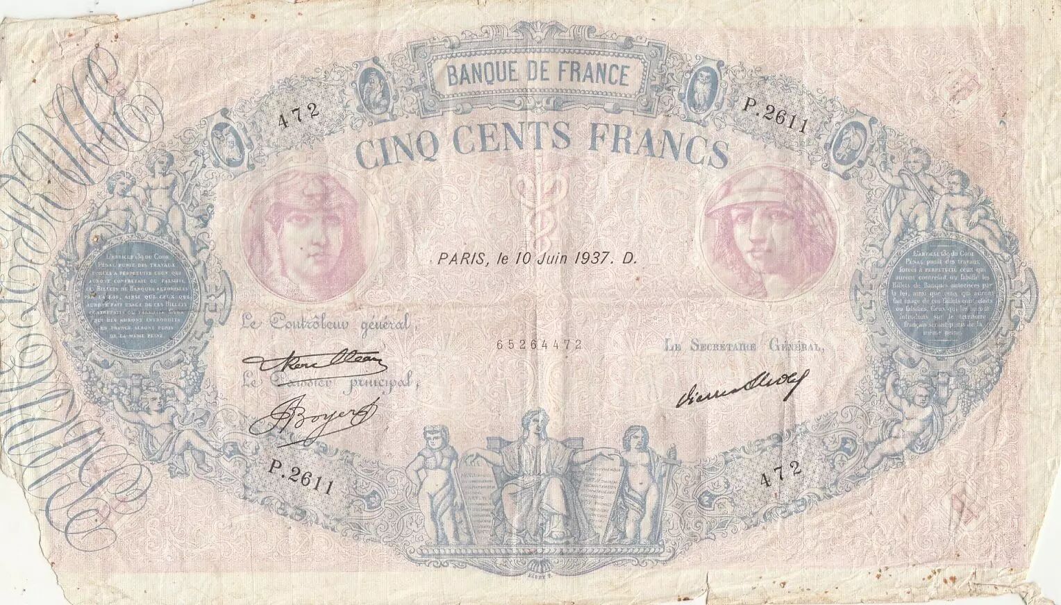 Accueil > Archivage > France 500 Francs Rose et Bleu - 10-06-1937 - Série P.2611