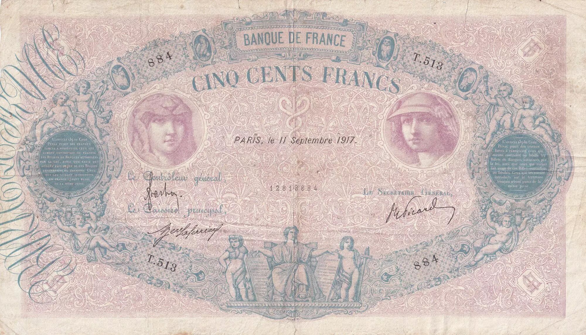 Accueil > Archivage > France 500 Francs - Rose et Bleu - 11-09-1917 - Série T.513 - F.30.23
