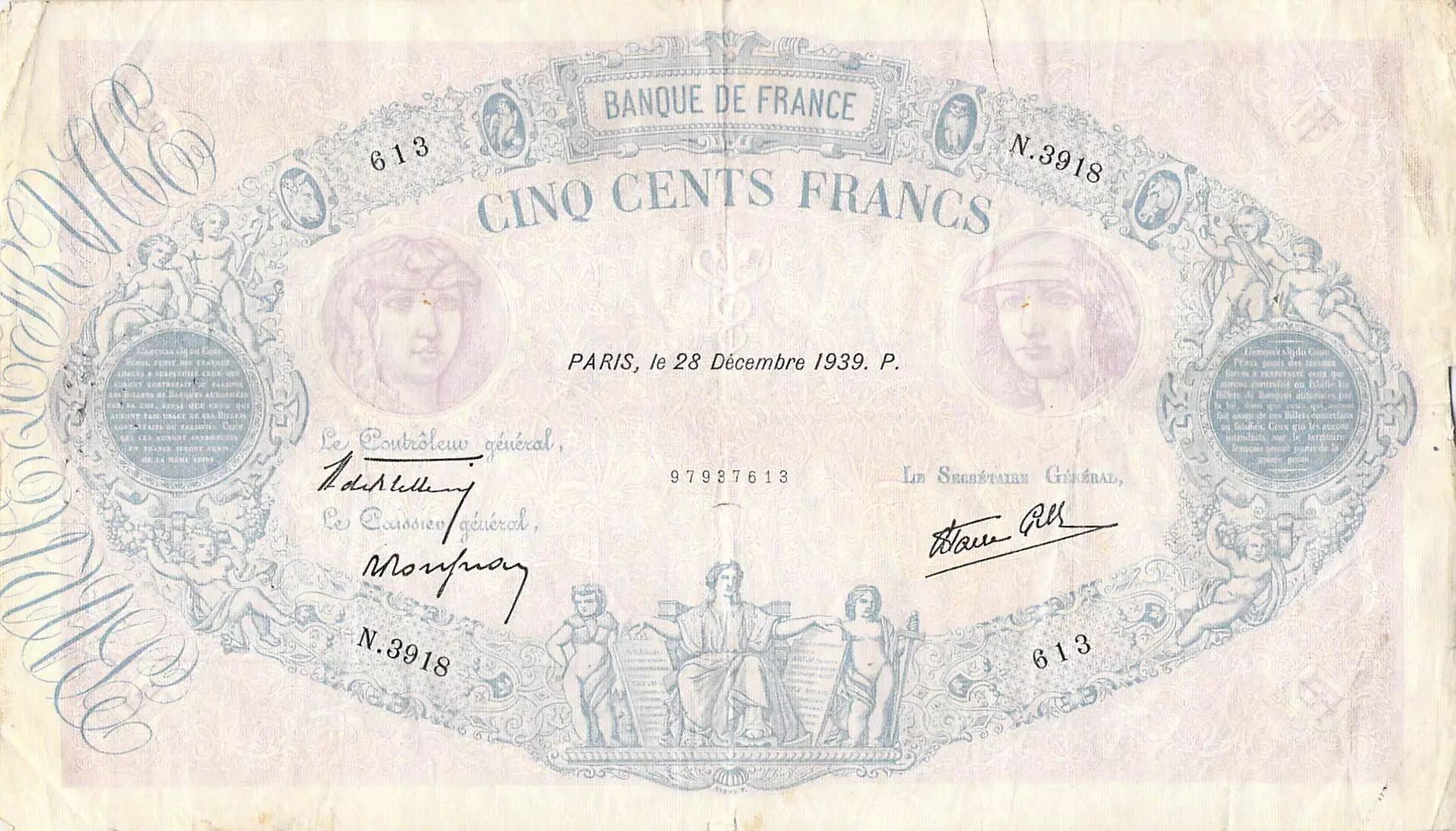 Billet France 500 Francs Rose et Bleu - 28-12-1939 Série N.3918 - TB