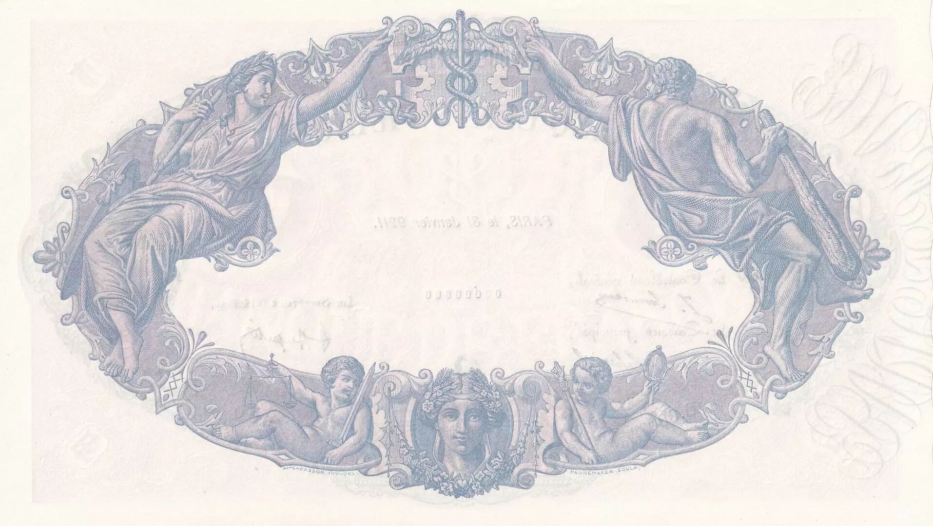 Rare watermarked specimen of the 500 Francs Blue and Pink. Only 2 examples known without perforations.
