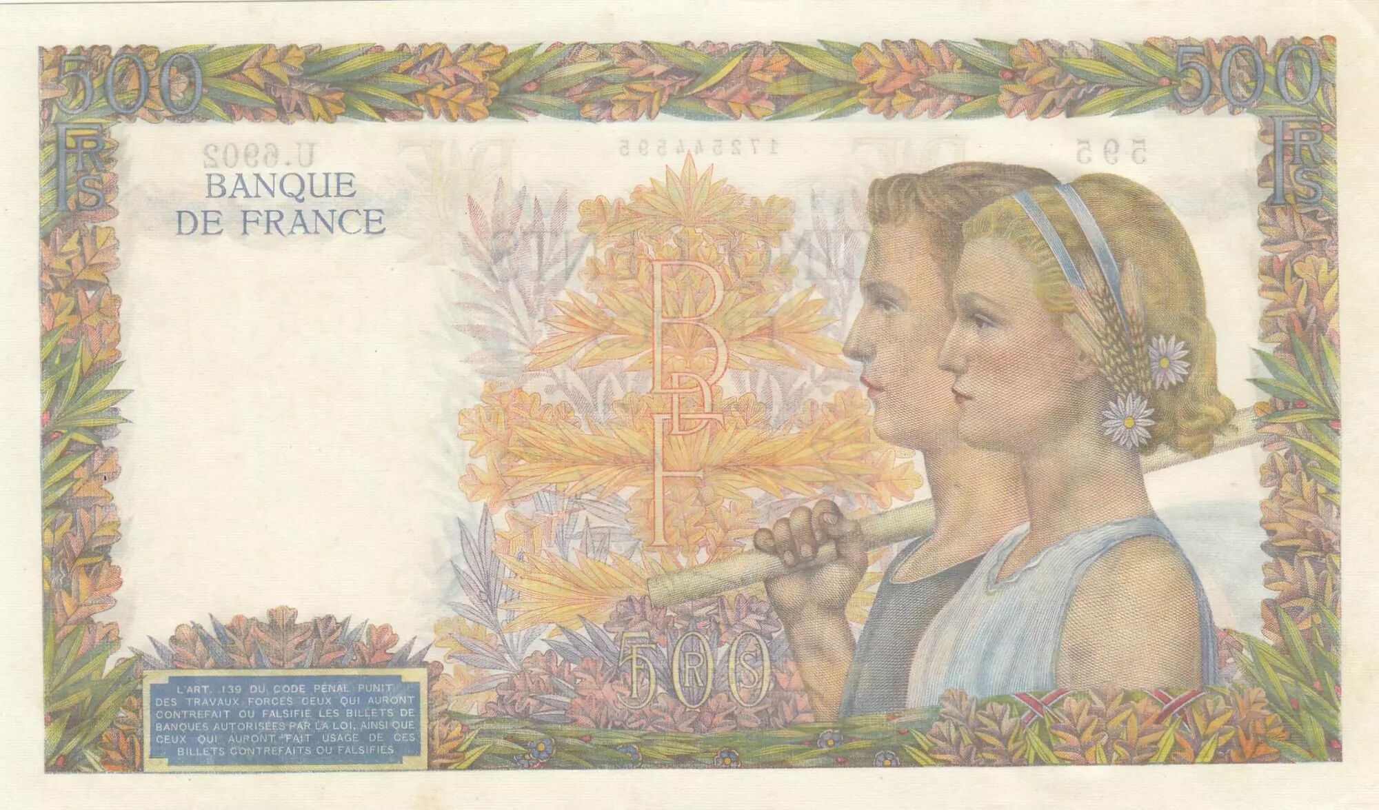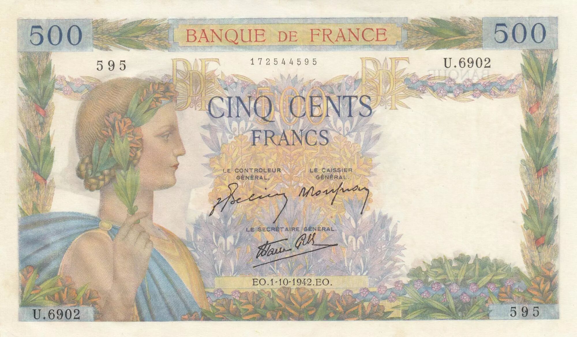 Banknote France 500 Francs - The peace- 01-10-1942 - Serial U.6902