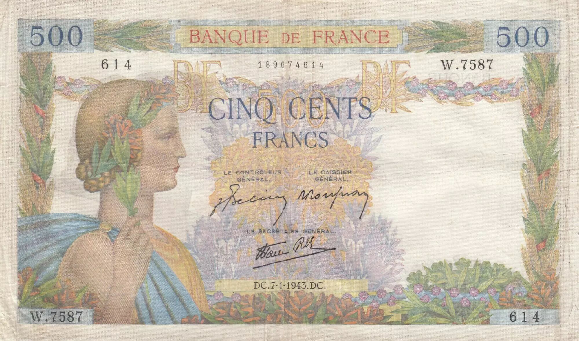 Banknote France 500 francs - The peace - 07-01-1943 - Serial W.7587