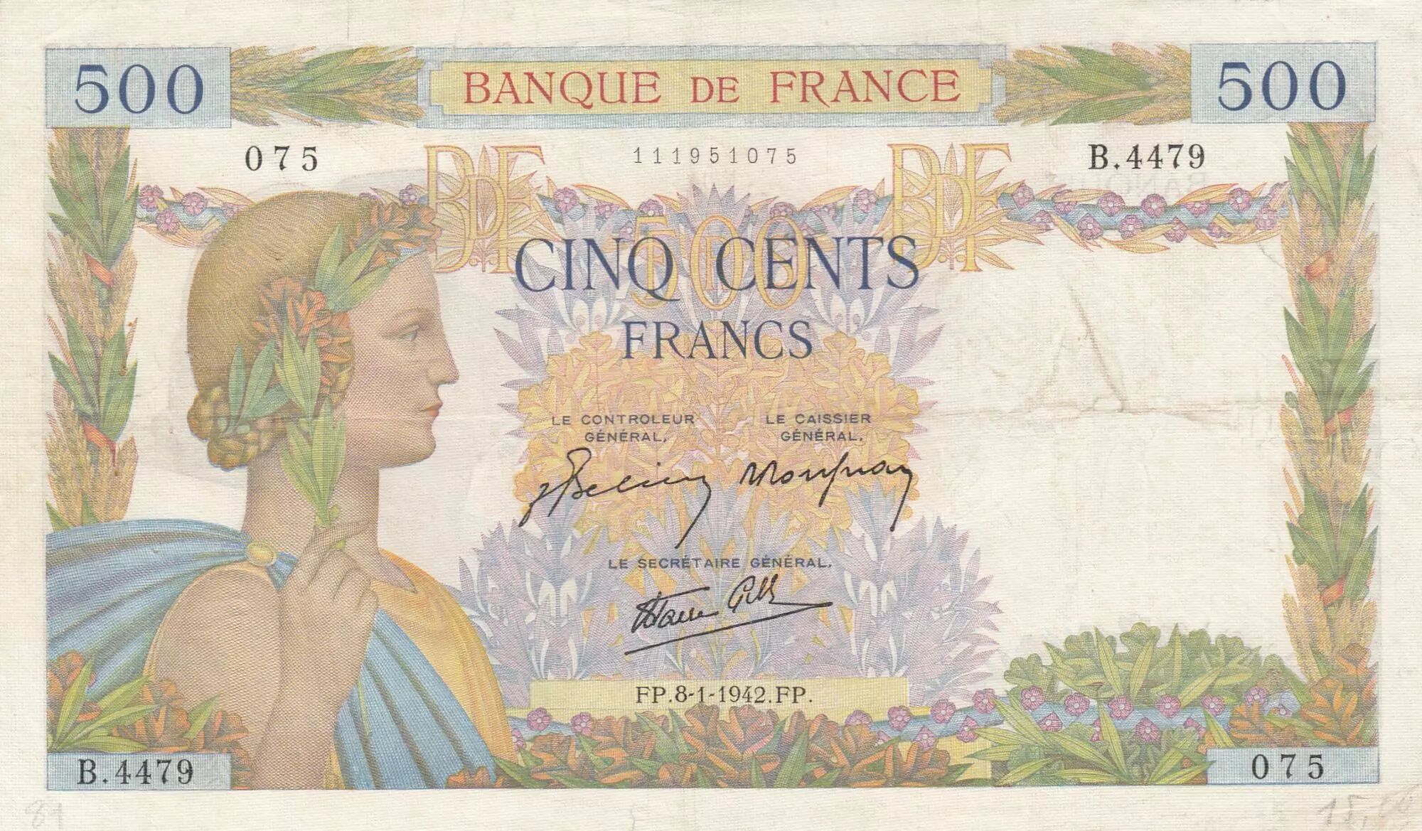 Banknote France 500 francs - The peace - 08-01-1942 - Serial B.4479