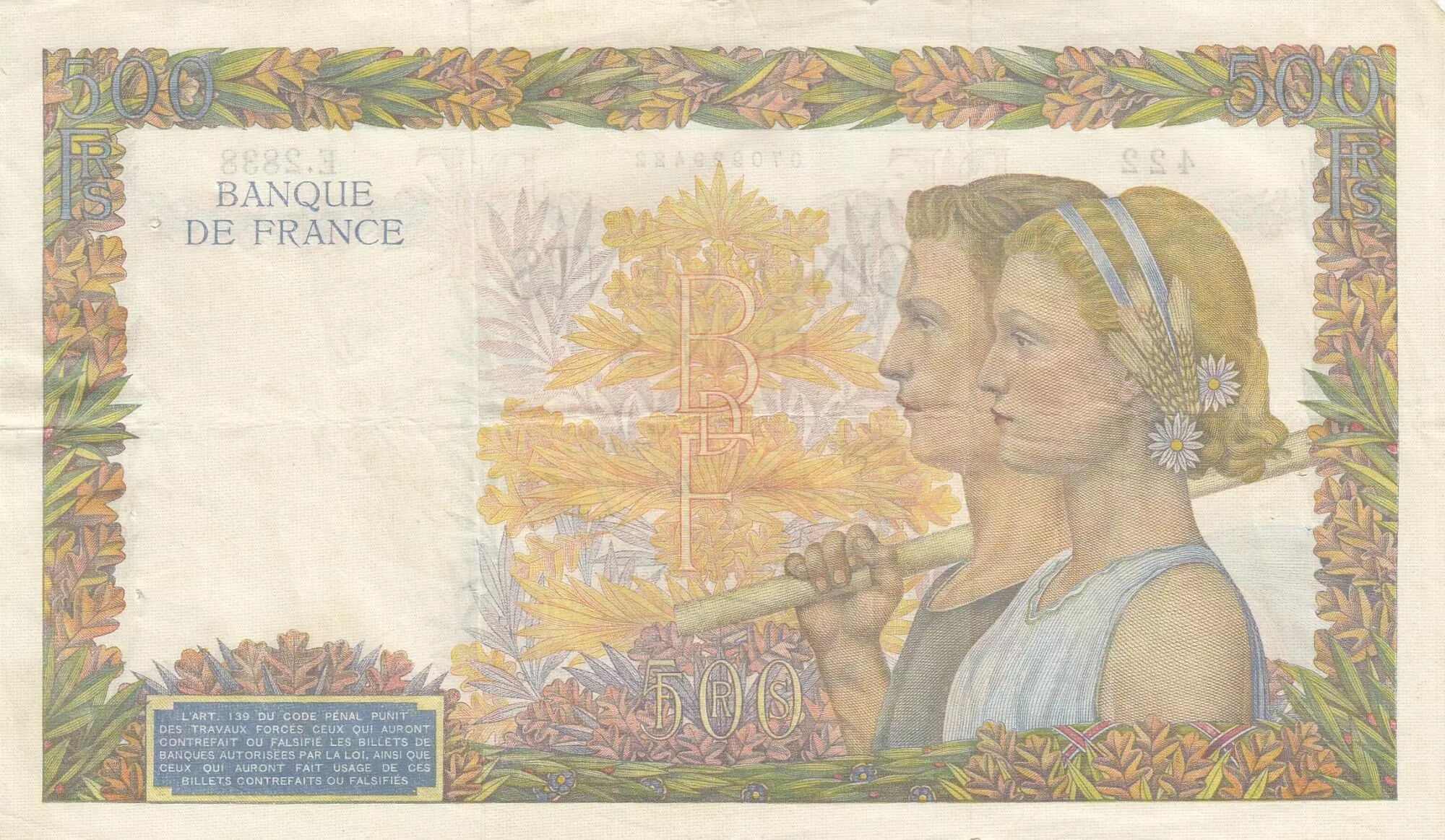 Banknote France 500 Francs - The peace - 08-05-1941 - Serial E.2838