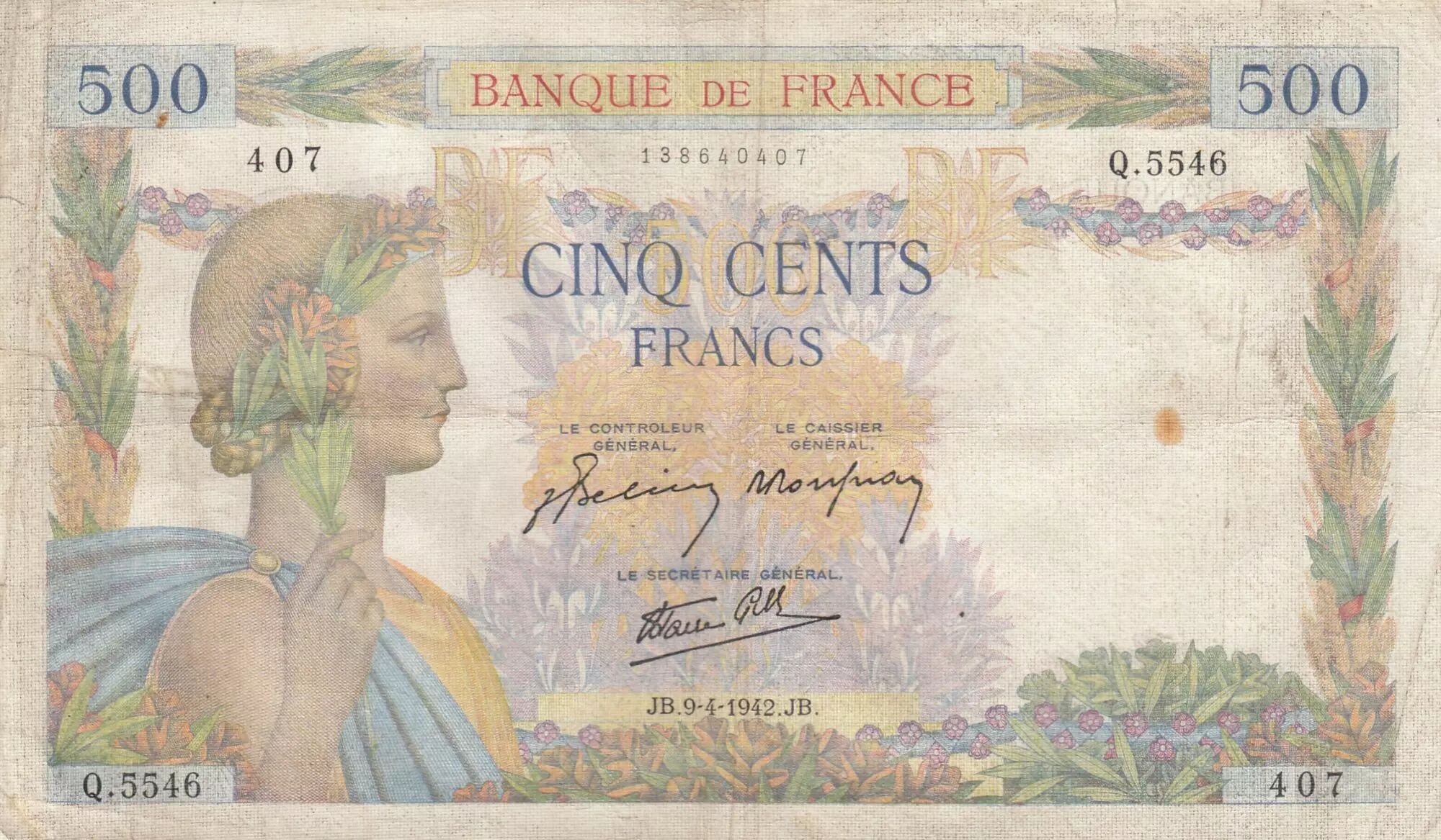 Home > > France 500 francs - The peace - 09-04-1942 - Serial Q.5546