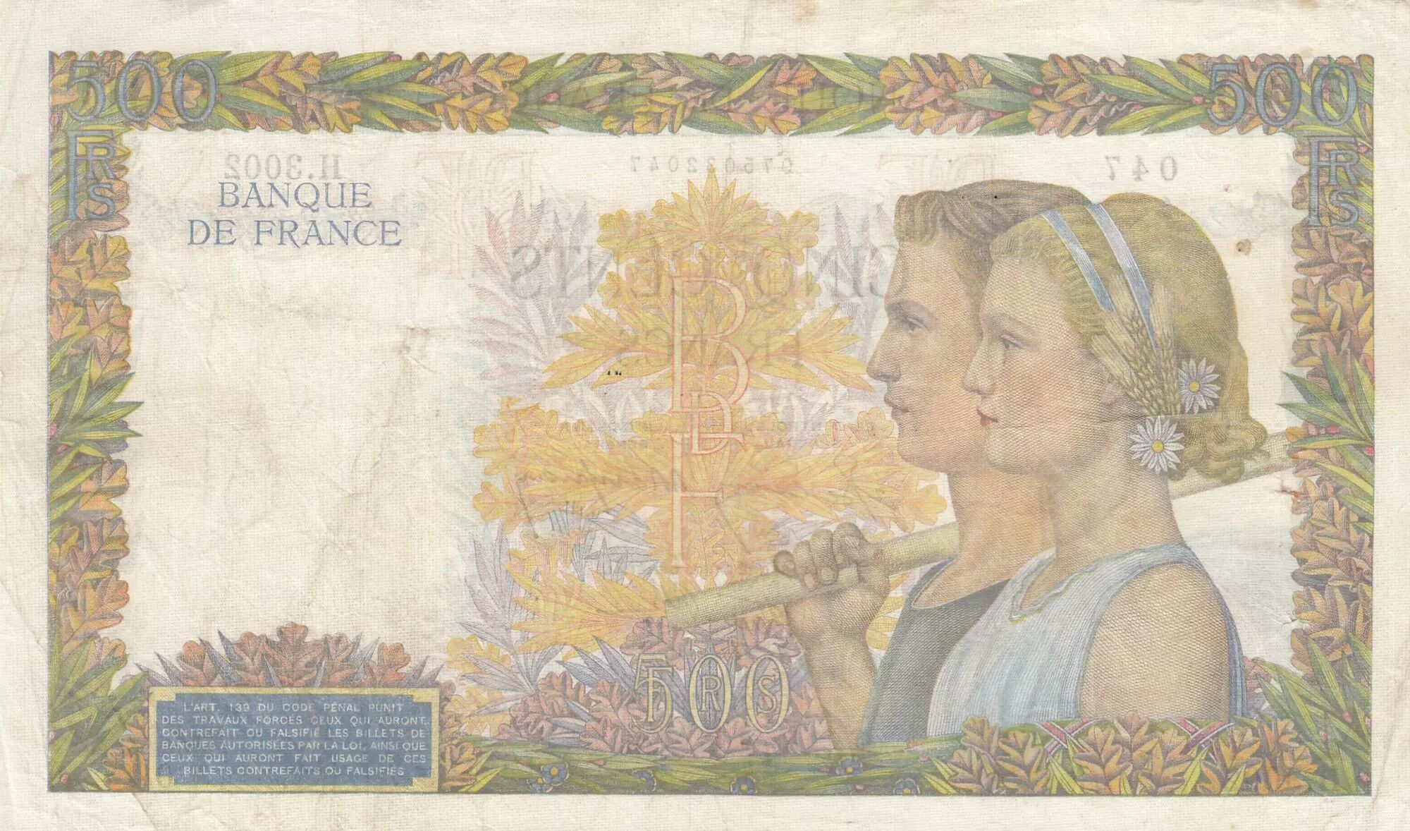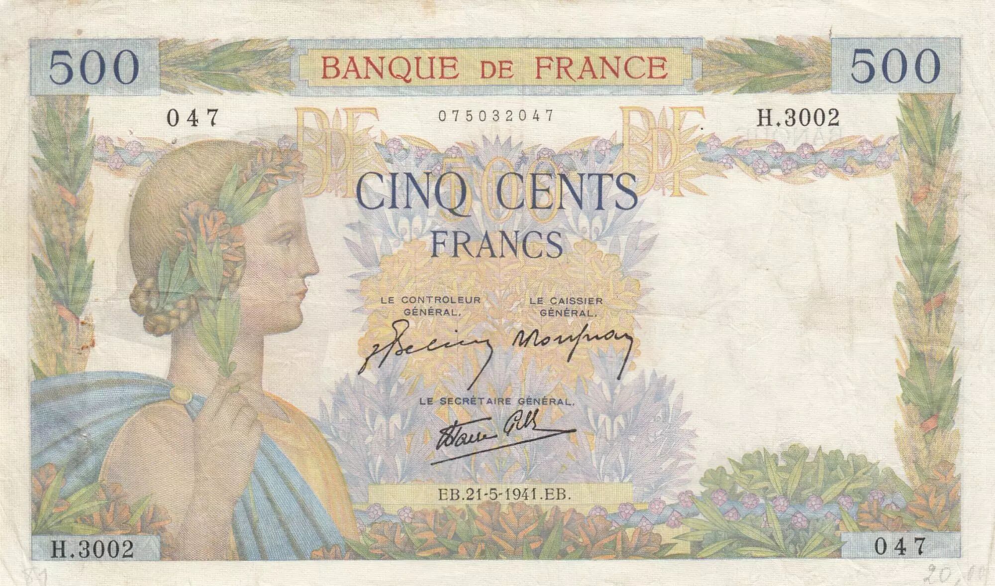 Banknote France 500 Francs - The peace - 21-05-1941 - Serial H.3002