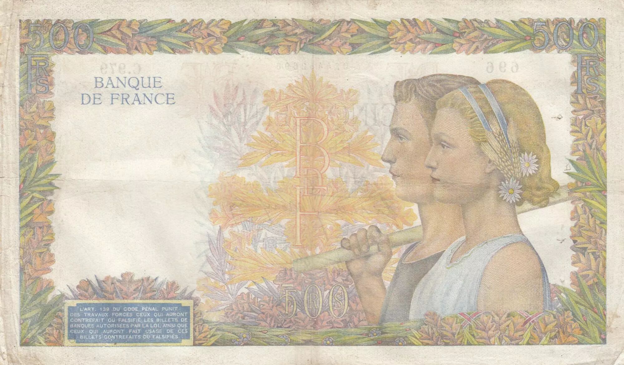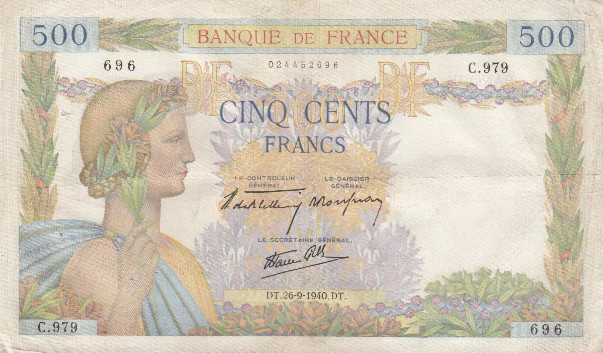 Banknote France 500 francs - The peace - 26-09-1940 - Serial C.979
