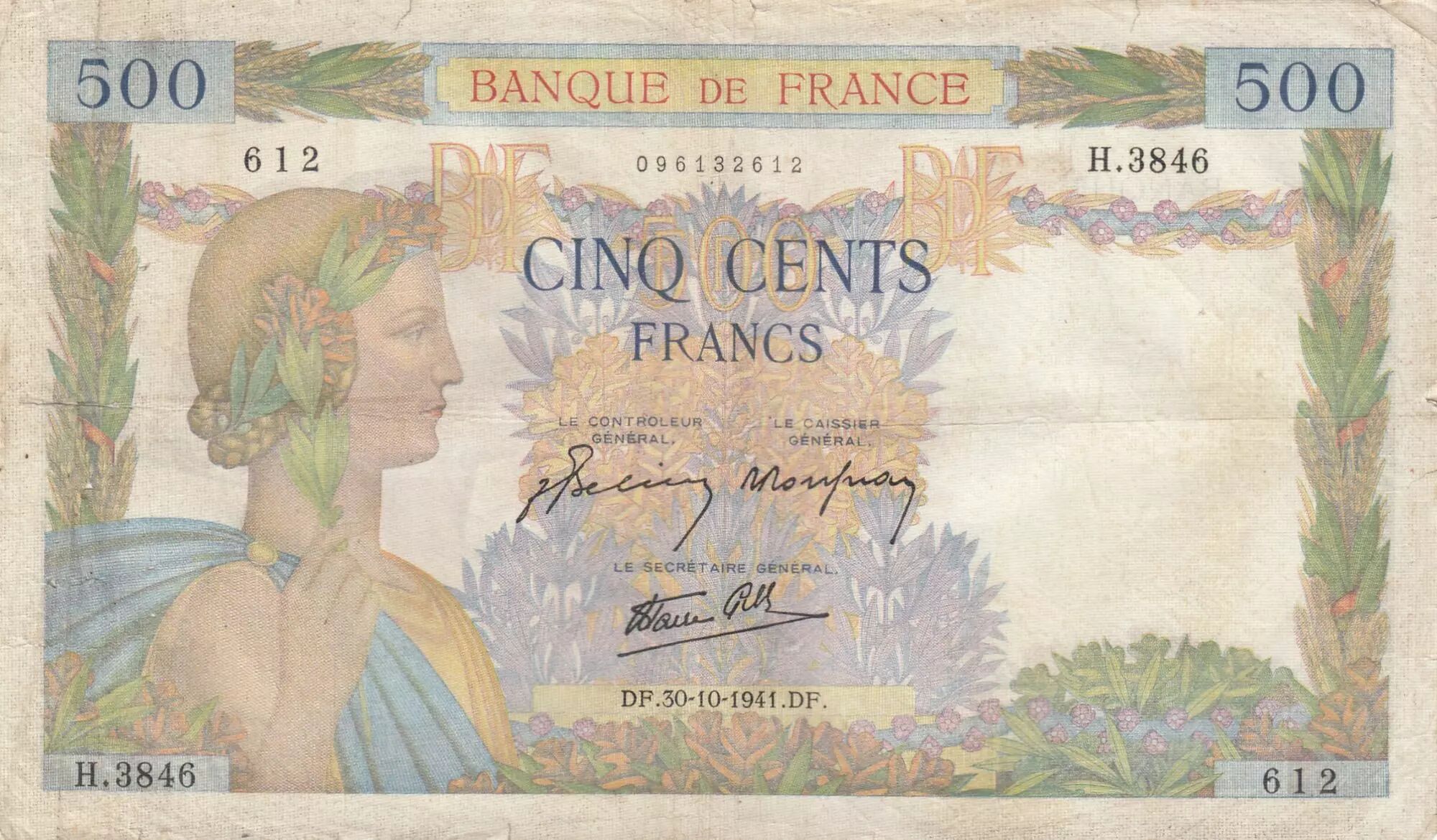 Banknote France 500 francs - The peace - 30-10-1941 - Serial H.3846