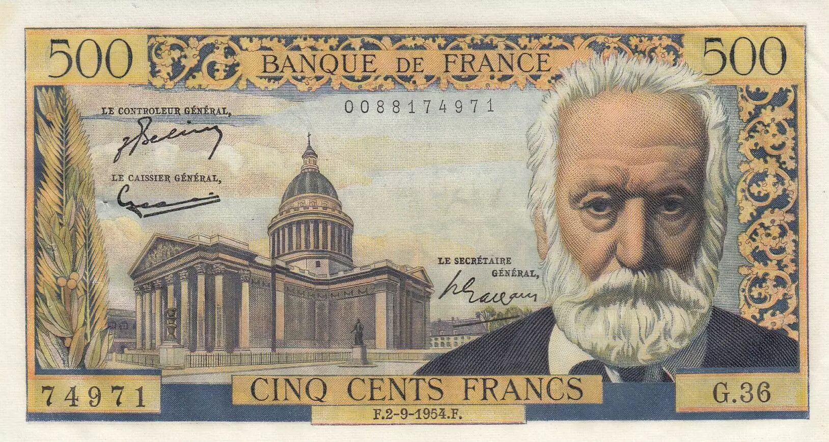 Le billet de 500 Francs, émis le 2 septembre 1954, est un produit de la Banque de France. Il appartient à la série G.36.