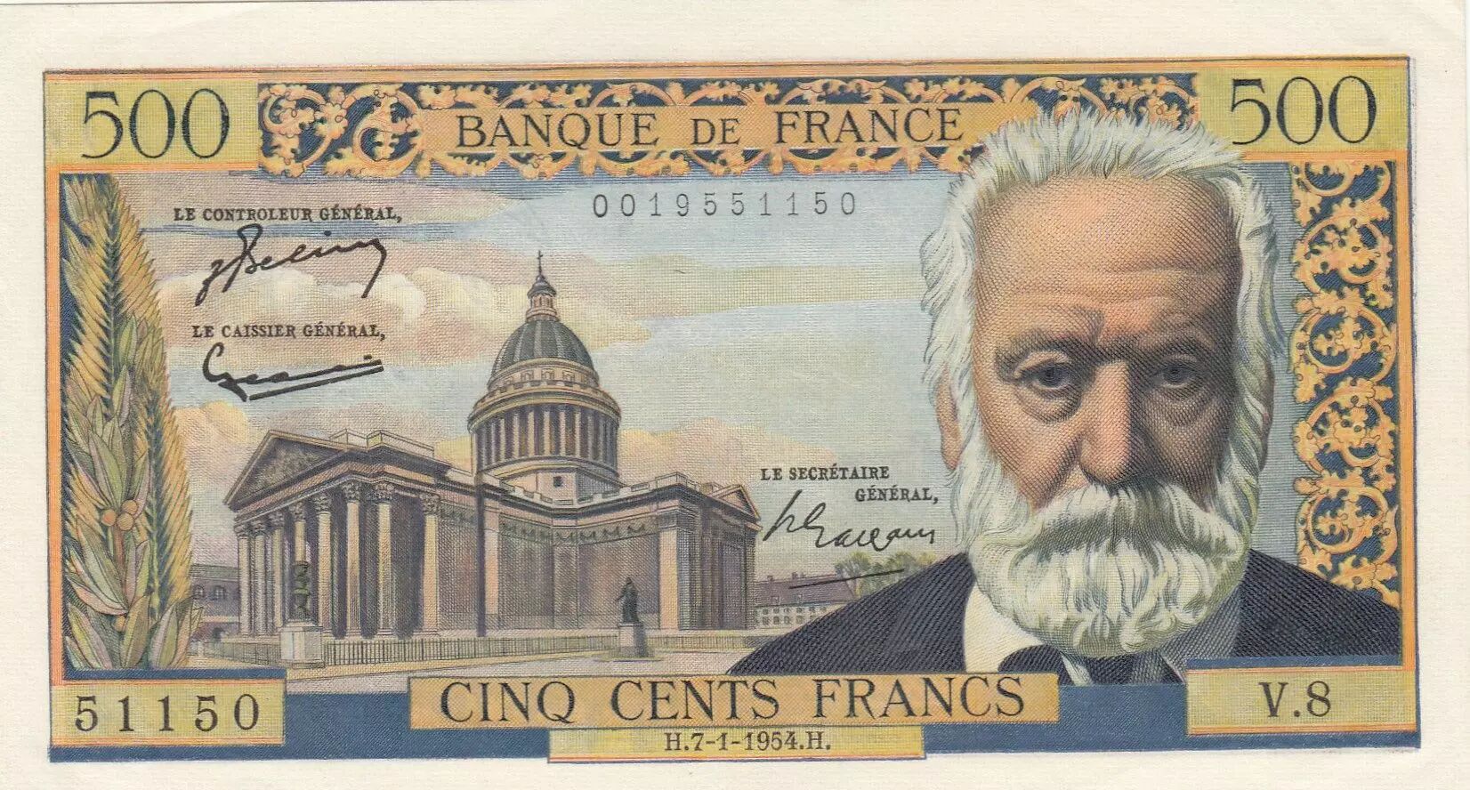 Le billet de 500 Francs, émis le 7 janvier 1954, est un produit de la Banque de France. Ce billet fait partie de la série V.8. La valeur nominale est de 500 francs.