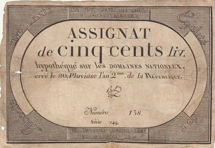 Banknote France 500 Livres - 20 Pluviose An II (8.2.1794) - F - Sign. Bol