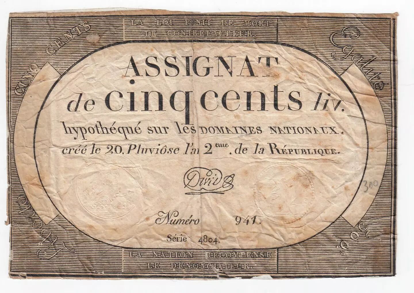 Billet France 500 Livres 20 Pluviose An II (8.2.1794) - Sign. David