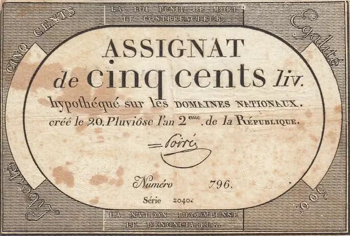 Accueil > Billets Français > Assignats > 500 Livres > France 500 Livres - 20 Pluviose An II (8.2.1794) - TB+ - Sign. Poiré