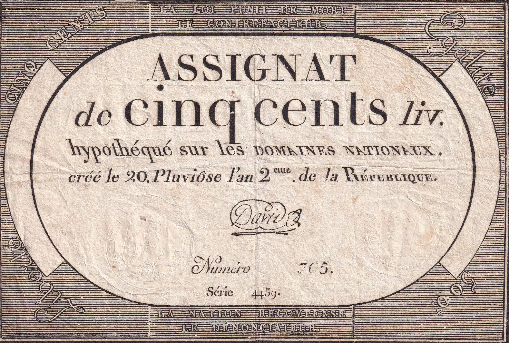 Banknote France 500 Livres - 20 Pluviose An II (8.2.1794) - VF - Sign. Busier
