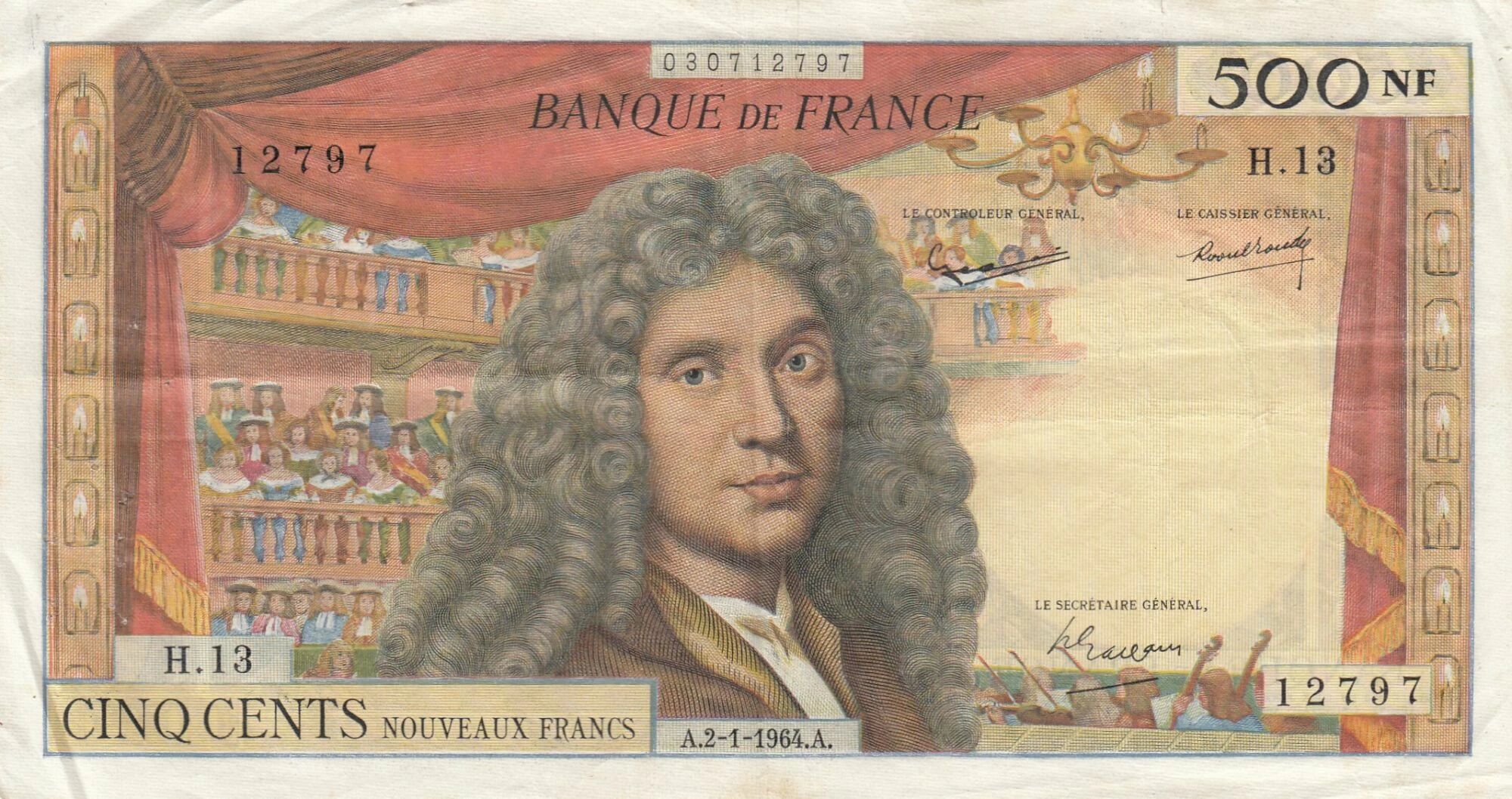 Au verso, on retrouve une scène théâtrale stylisée, évoquant l'univers des comédies de Molière. Des personnages en costumes d'époque sont représentés devant un décor architectural. La valeur nominale, "500", est répétée en chiffres. La mention "BANQUE DE FRANCE" figure en haut du billet, tandis que la devise "Liberté, Egalité, Fraternité" est inscrite en bas. Le numéro de série du billet est imprimé en noir, permettant son identification unique. Les couleurs dominantes du billet sont le bleu et le vert, conférant une esthétique classique et élégante.