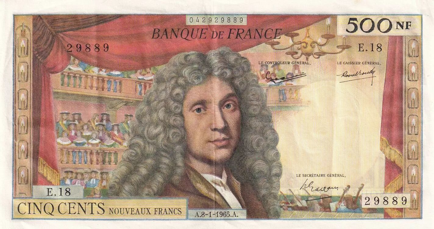 The 500 New Francs Molière banknote, issued on January 8, 1965, is a Product Type from France. Its face value is 500 new francs (NF). The dimensions of this banknote are 182 millimeters in length and 97 millimeters in width.
